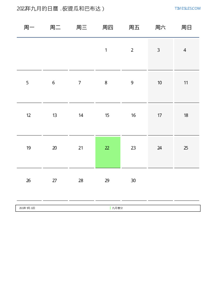 下載並打印2022年九月安提瓜和巴布达節假日和周末的PDF日曆