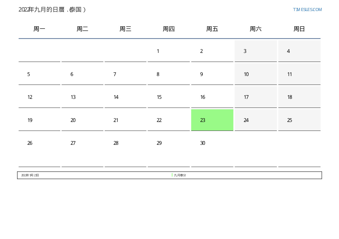 下載並打印2022年九月为泰国節假日和周末的PDF日曆