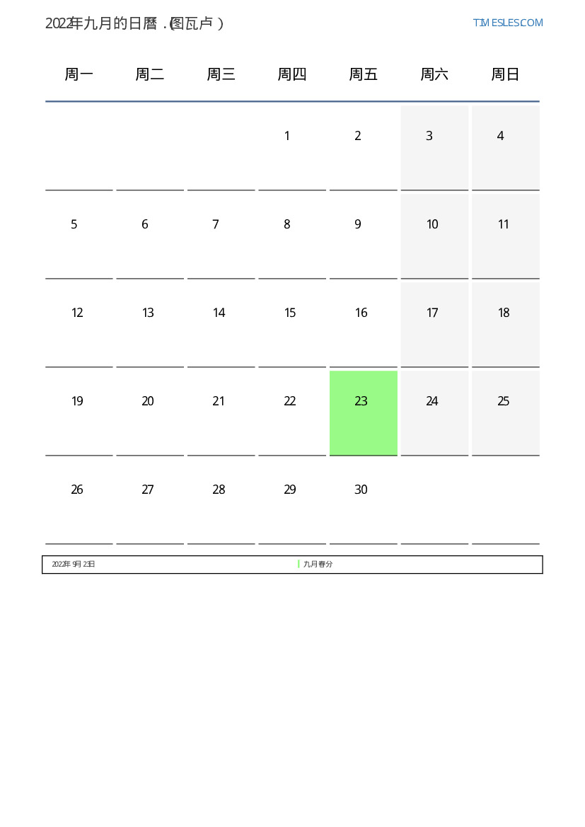 对于图瓦卢2022年九月日曆