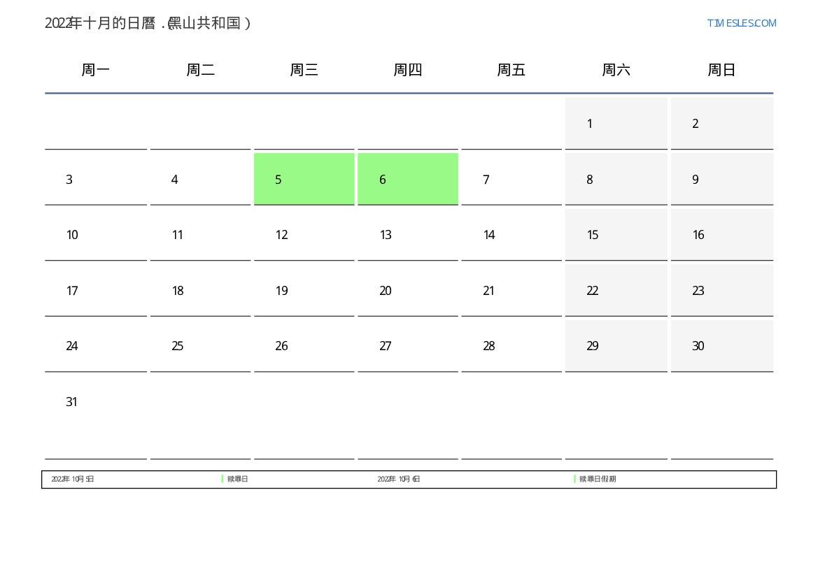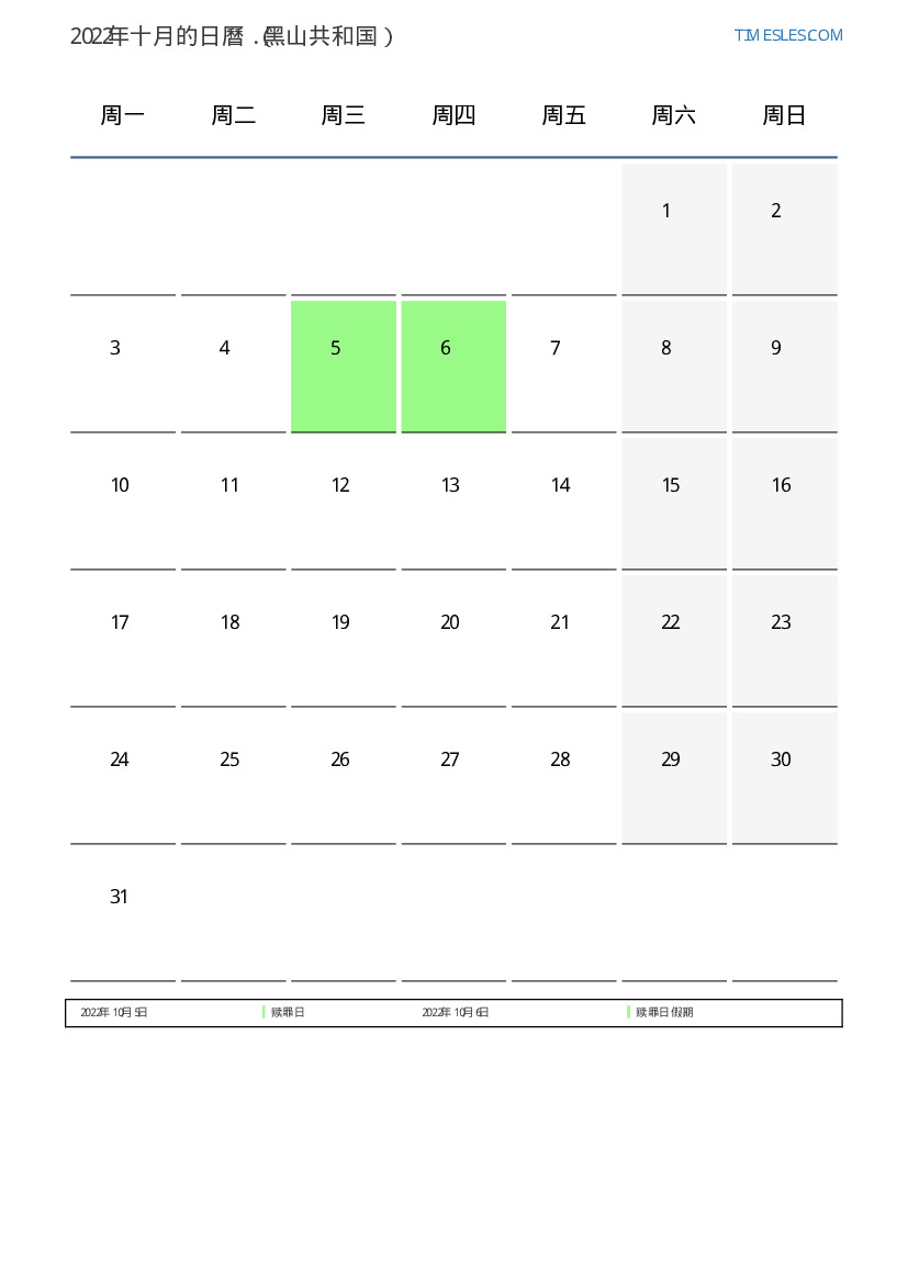 十月包含31天。 這是2022年的10個月。 在2022年十月,在黑山有2 假期和休假。