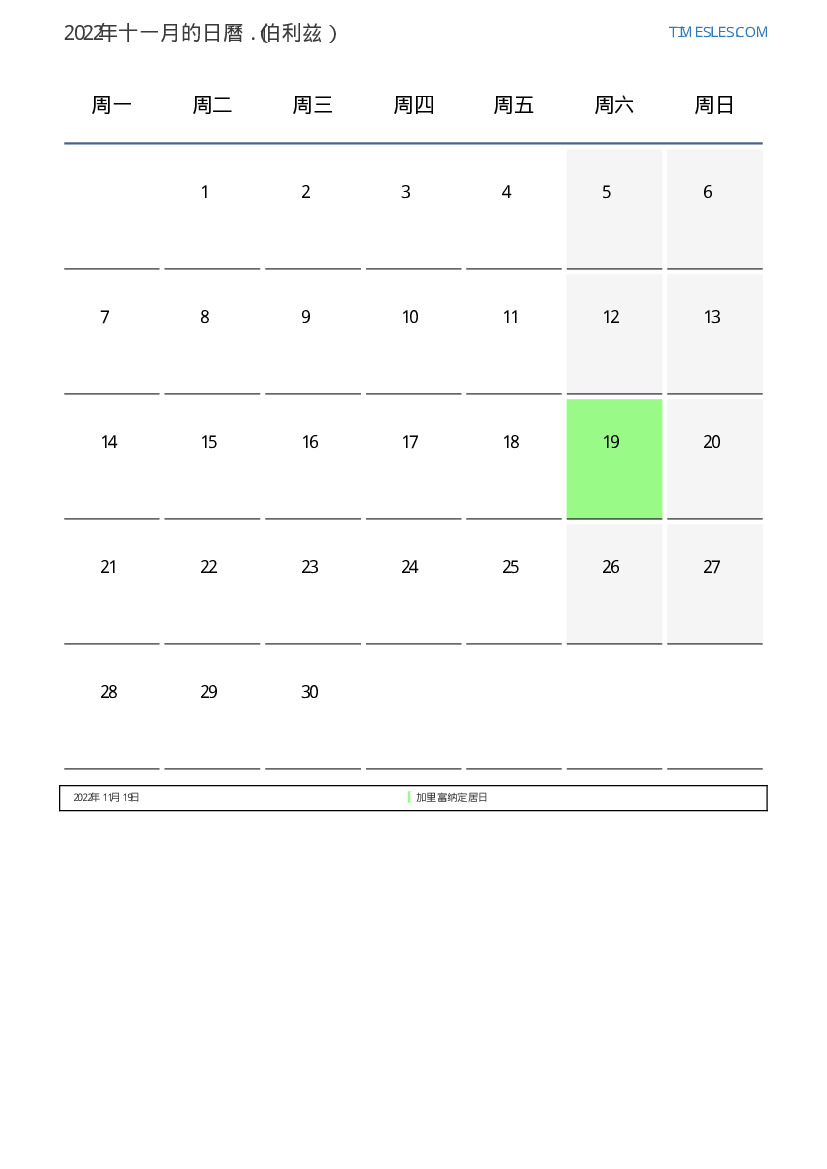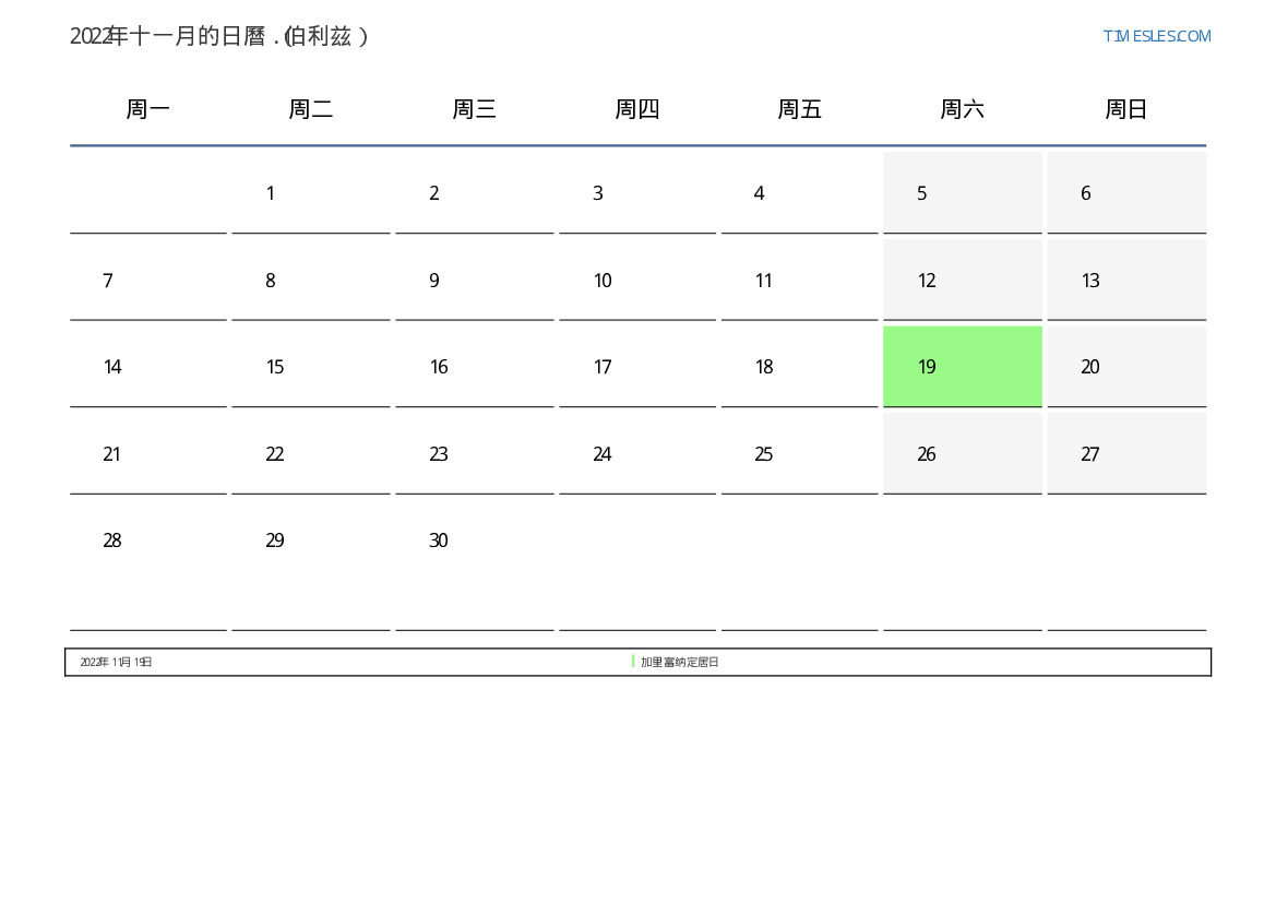 对于伯利兹2022年十一月的假期和周末日曆