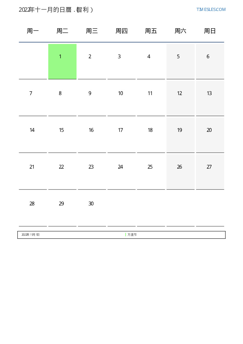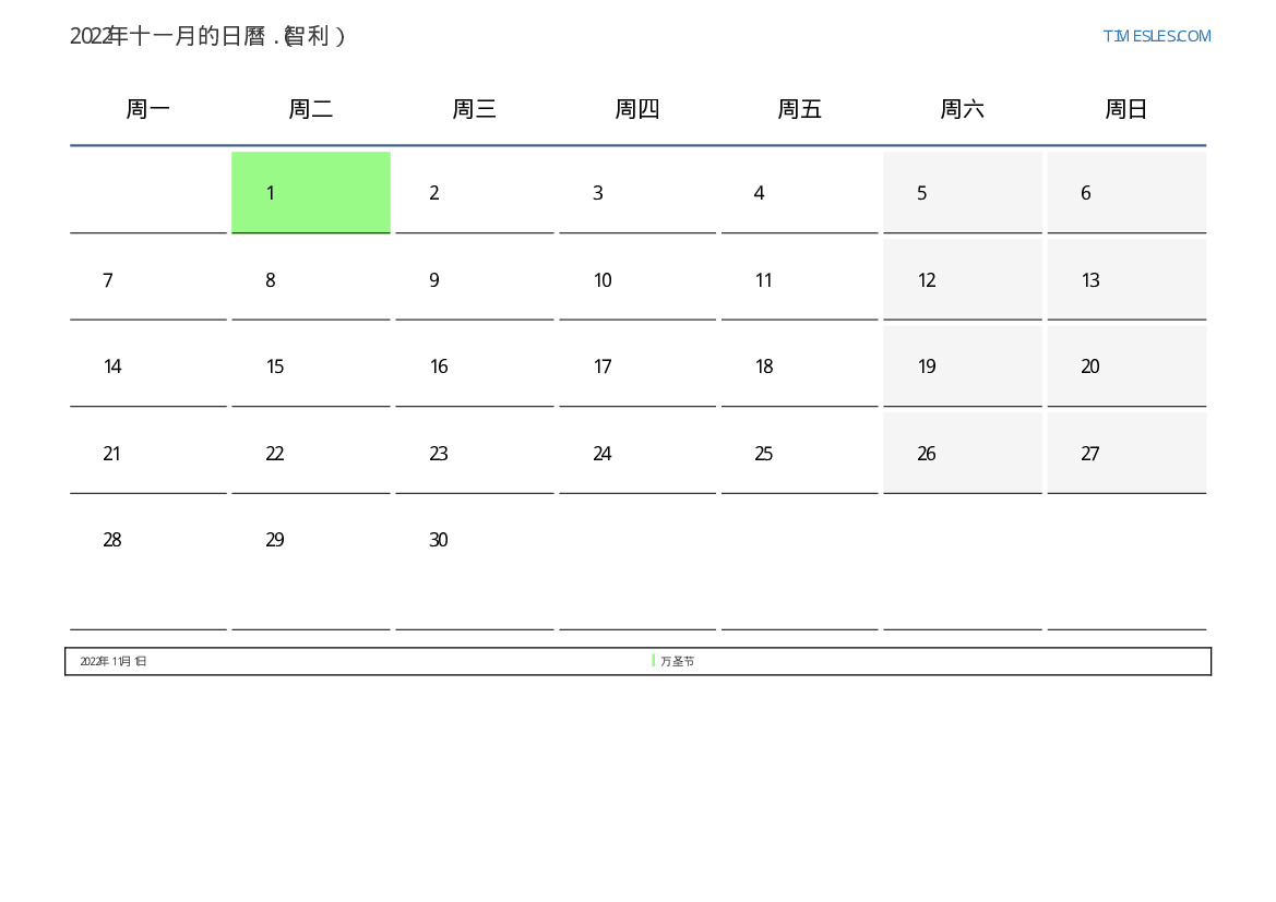 十一月包含30天。 這是2022年的11個月。 在2022年十一月,在智利有1 假期和休假。