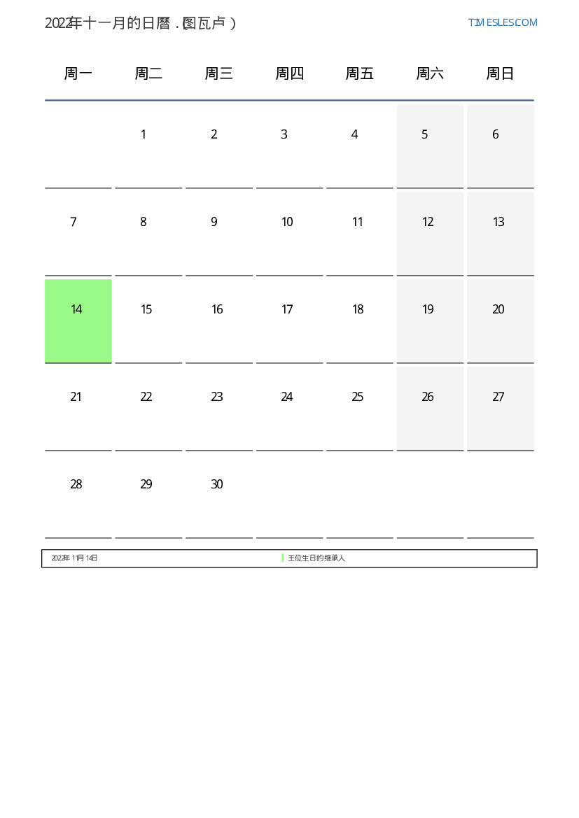 下載並打印2022年十一月对于图瓦卢節假日和周末的PDF日曆