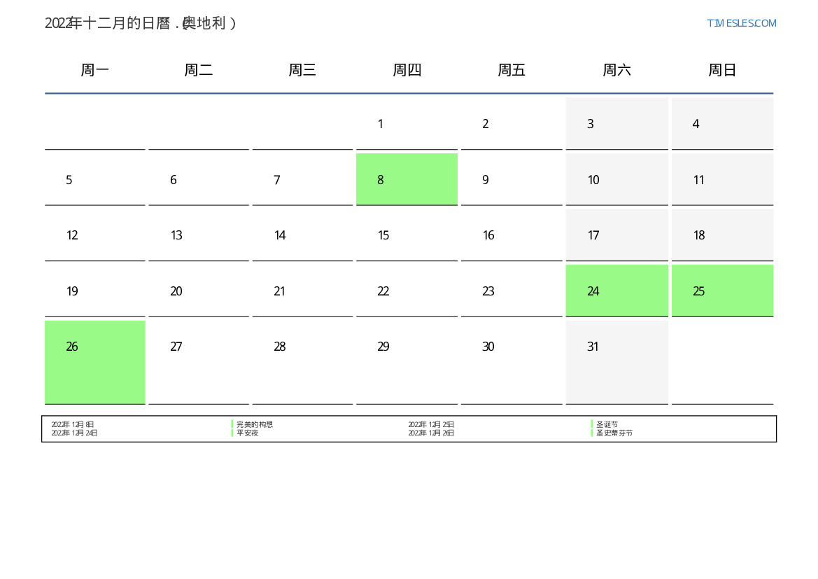 下載並打印2022年十二月奥地利節假日和周末的PDF日曆