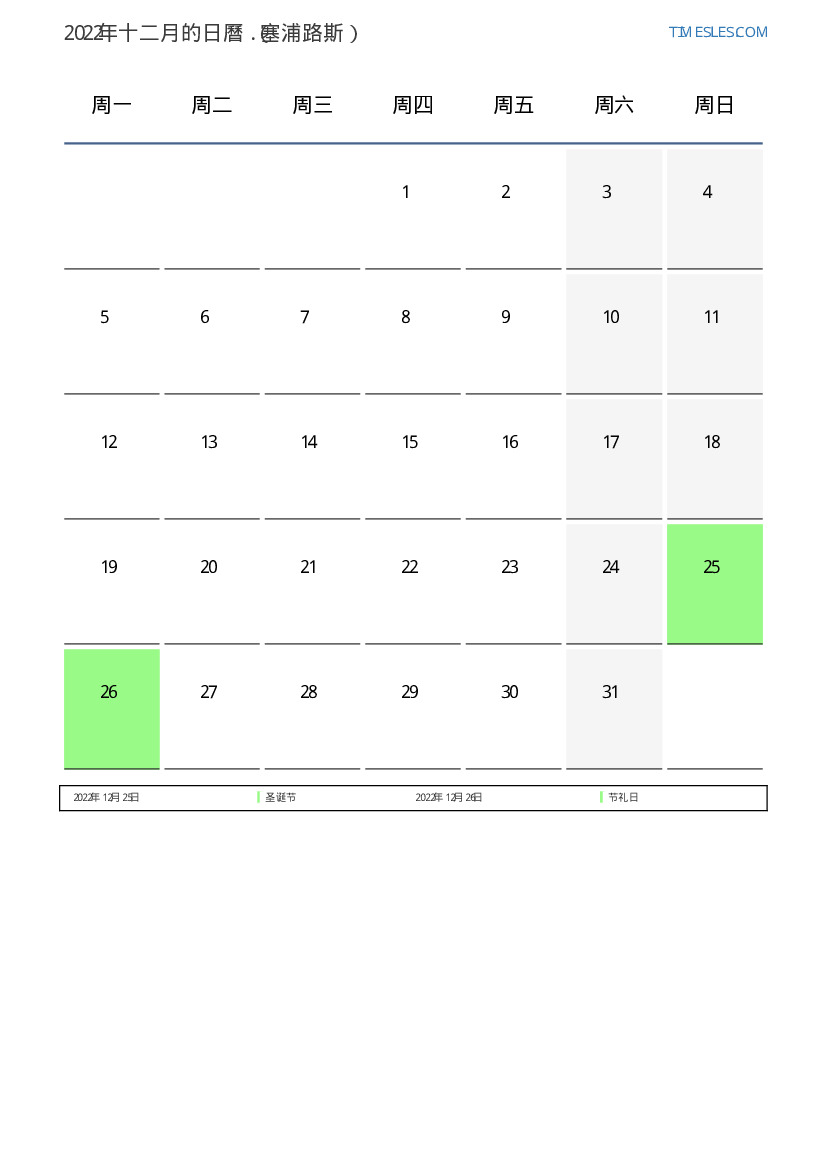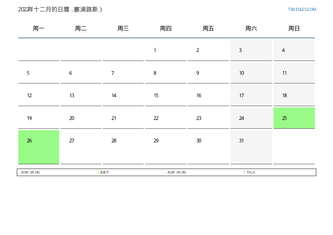 下載並打印2022年十二月塞浦路斯節假日和周末的PDF日曆