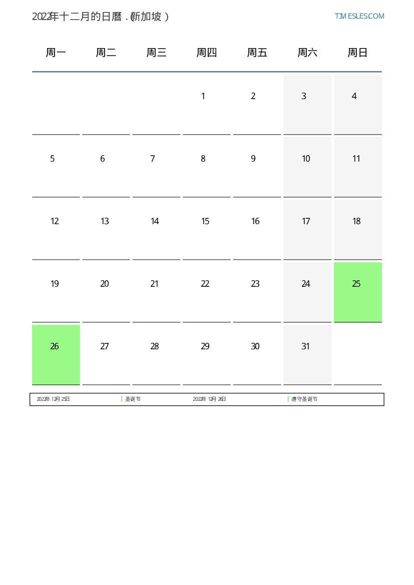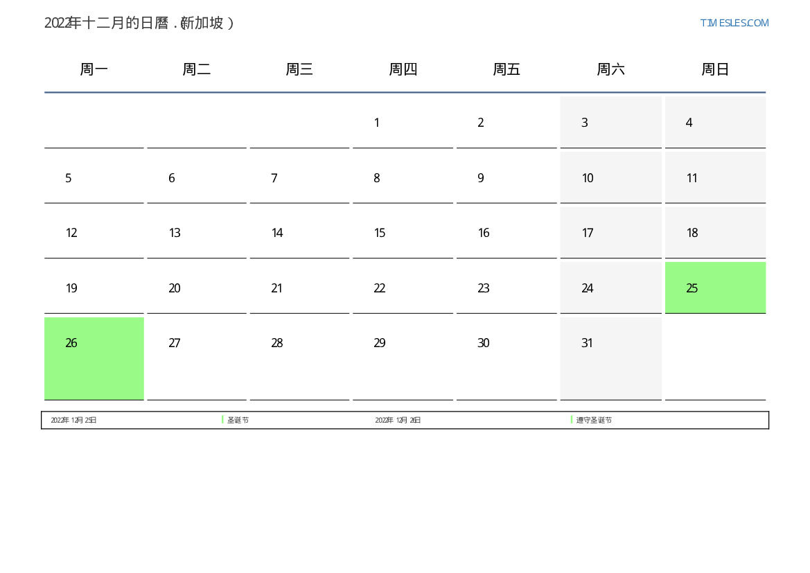 对于新加坡2022年十二月的假期和周末日曆