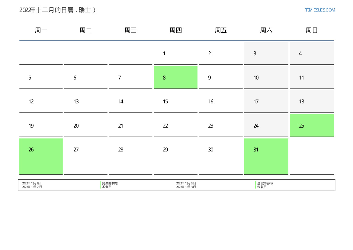 下載並打印2022年十二月瑞士節假日和周末的PDF日曆