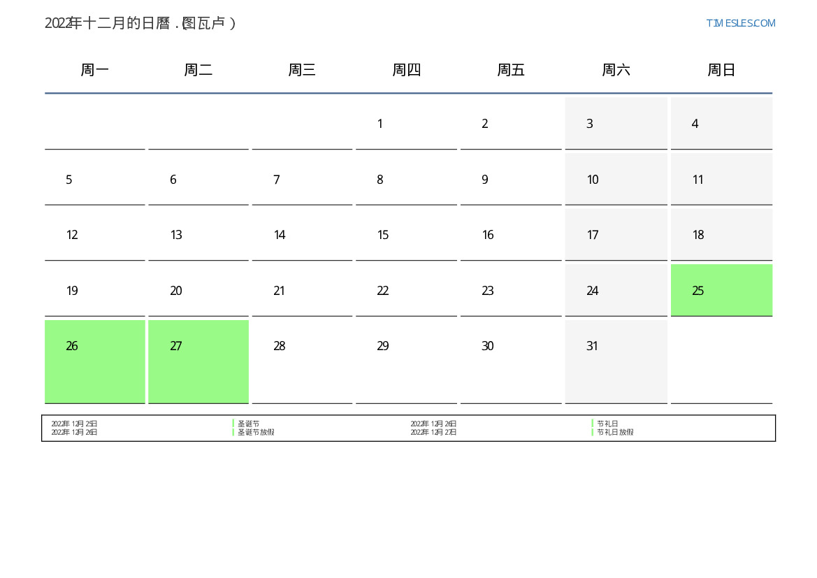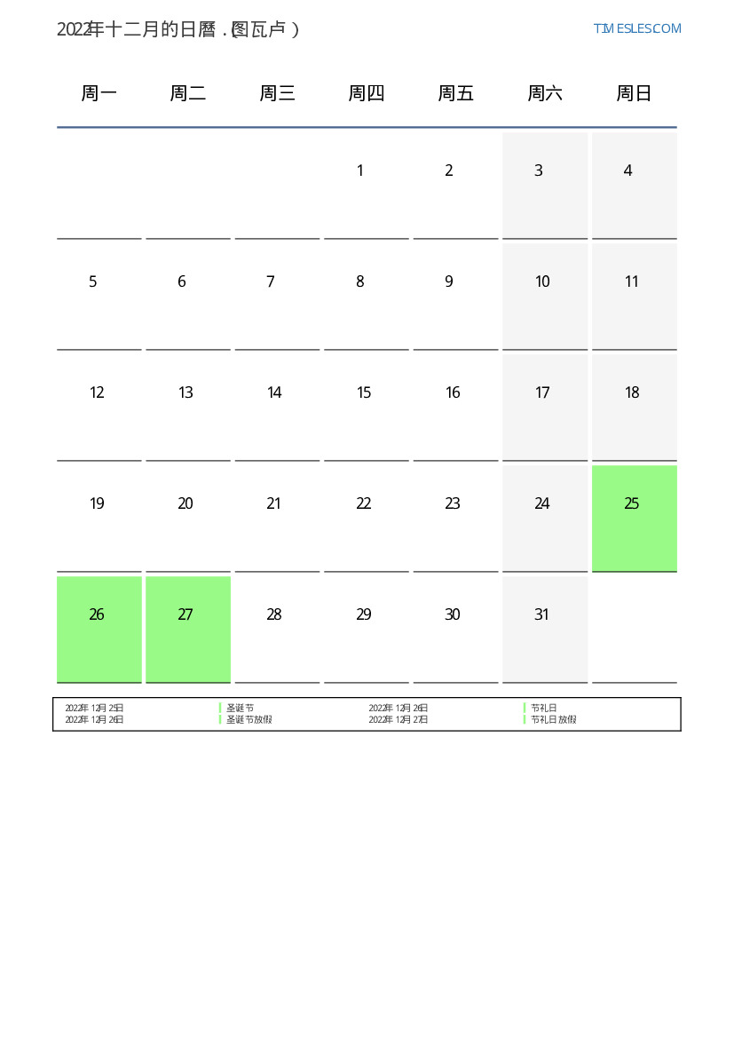 十二月包含31天。 這是2022年的12個月。 在2022年十二月,在图瓦卢有5 假期和休假。