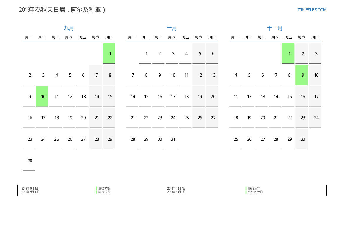 阿尔及利亚下載並打印2019年為秋天假期和周末的PDF日曆