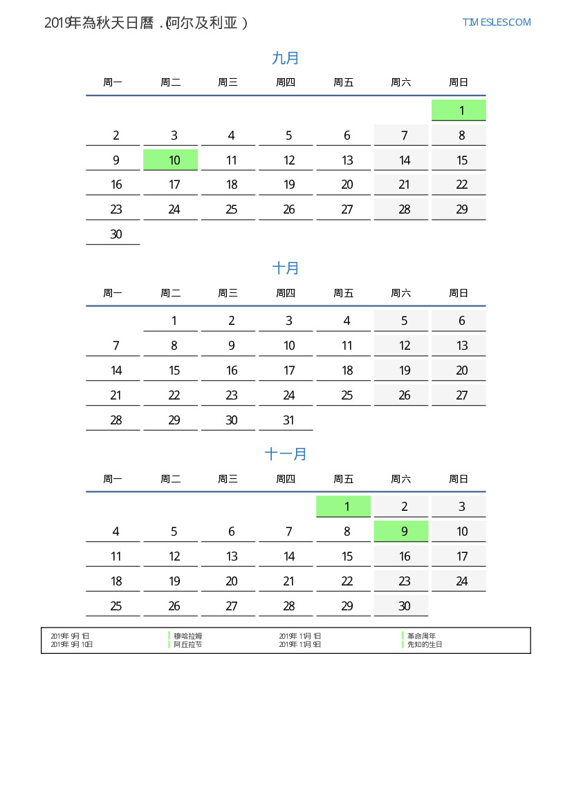 阿尔及利亚2019年為秋天假期和周末的日曆