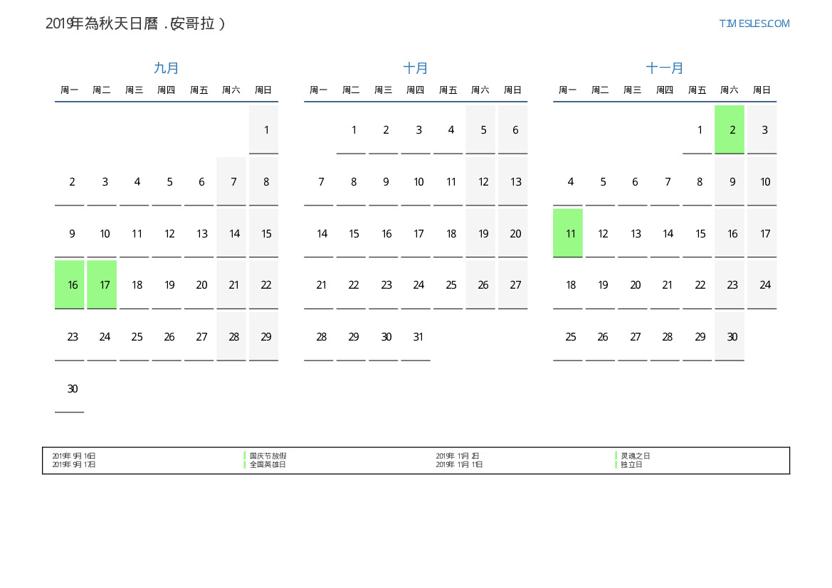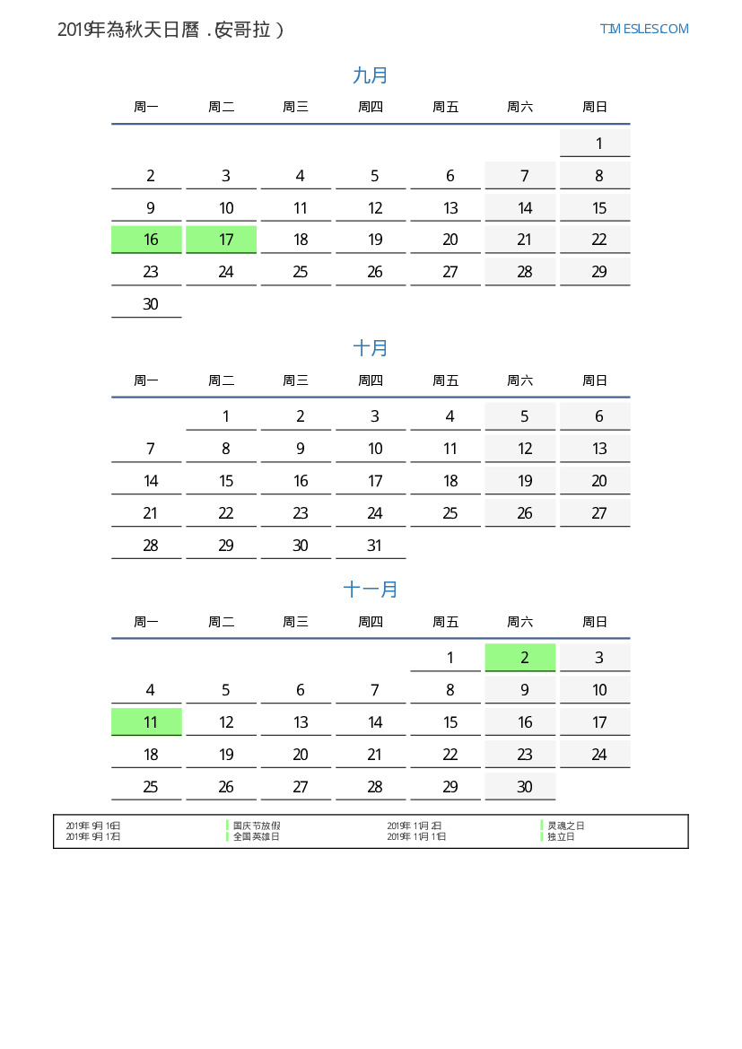 为安哥拉下載並打印2019年為秋天假期和周末的PDF日曆