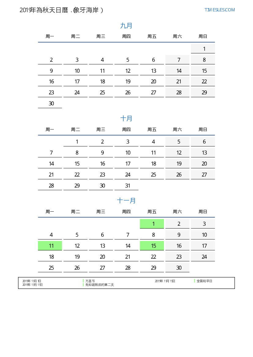 科特迪瓦下載並打印2019年為秋天假期和周末的PDF日曆