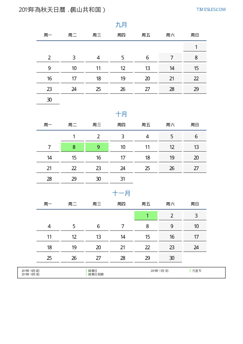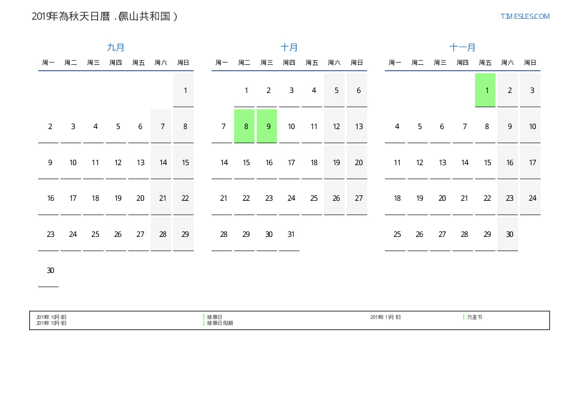 黑山共和国下載並打印2019年為秋天假期和周末的PDF日曆