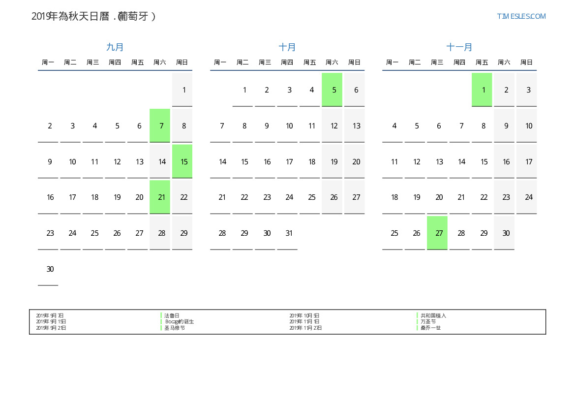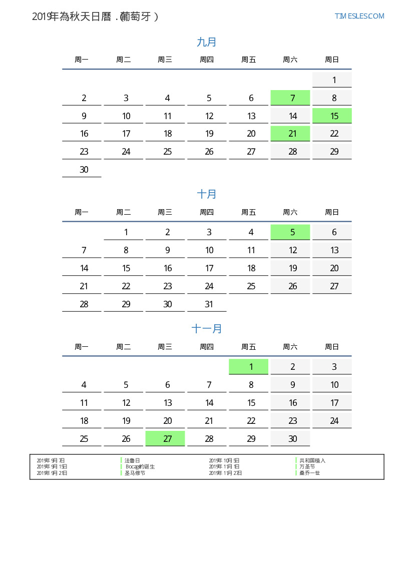 葡萄牙下載並打印2019年為秋天假期和周末的PDF日曆