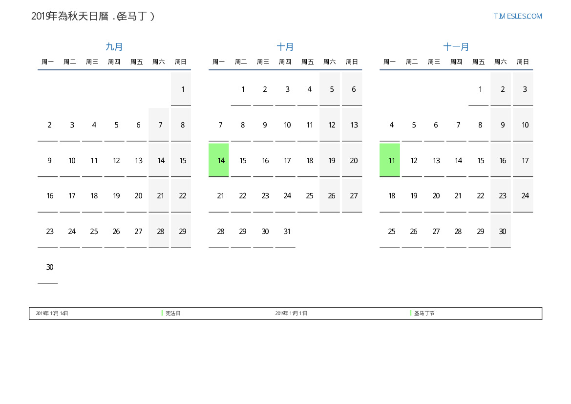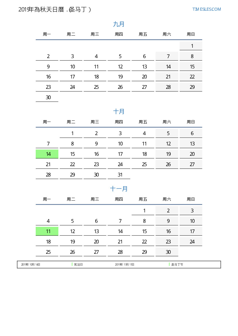 为圣马丁下載並打印2019年為秋天假期和周末的PDF日曆