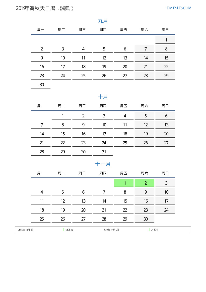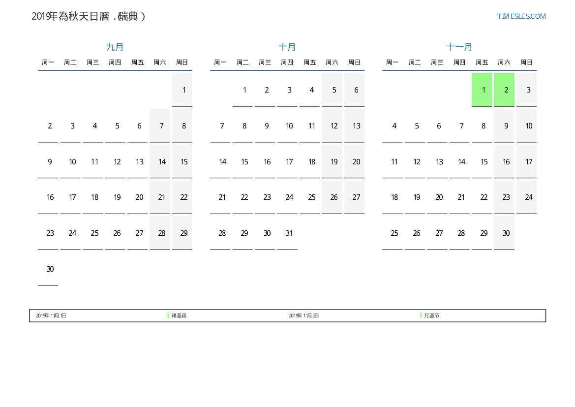 瑞典下載並打印2019年為秋天假期和周末的PDF日曆