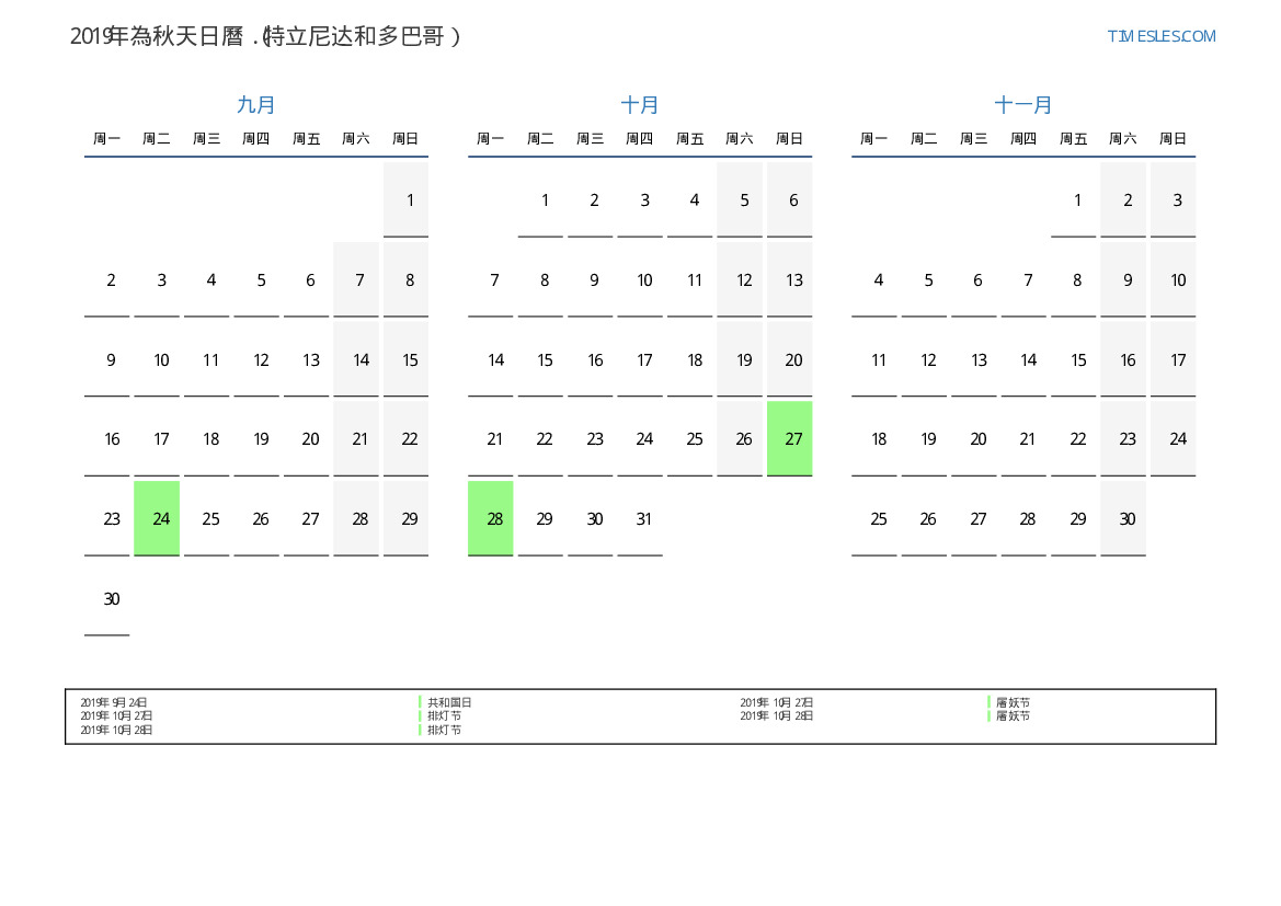 特立尼达和多巴哥2019年為秋天假期和周末的日曆