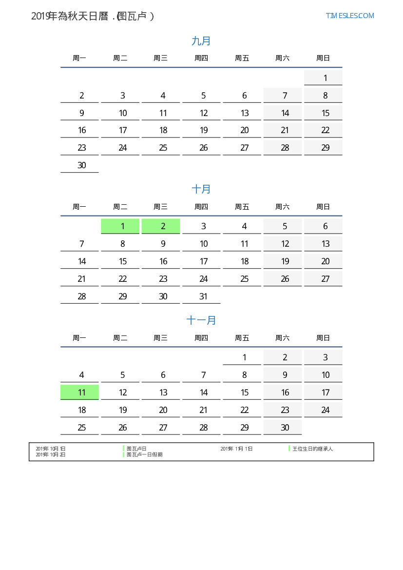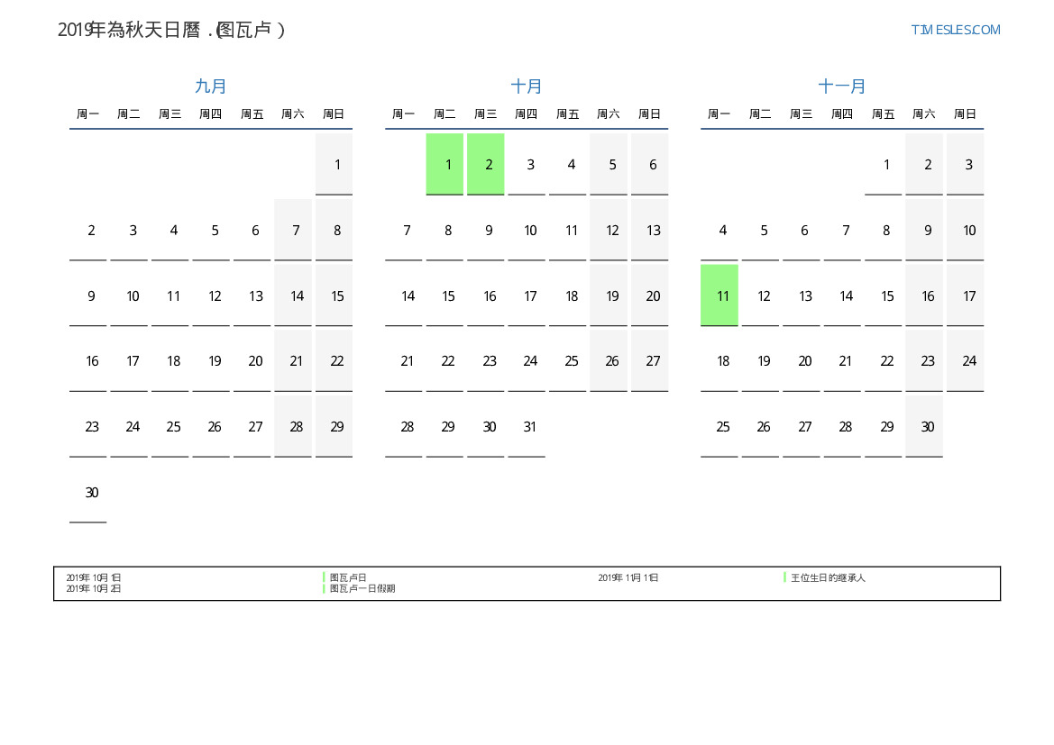 对于图瓦卢2019年為秋天假期和周末的日曆