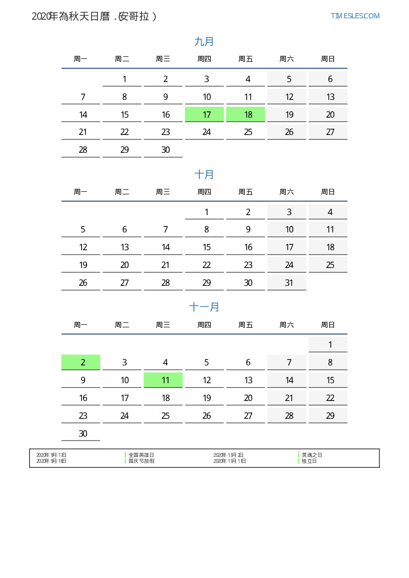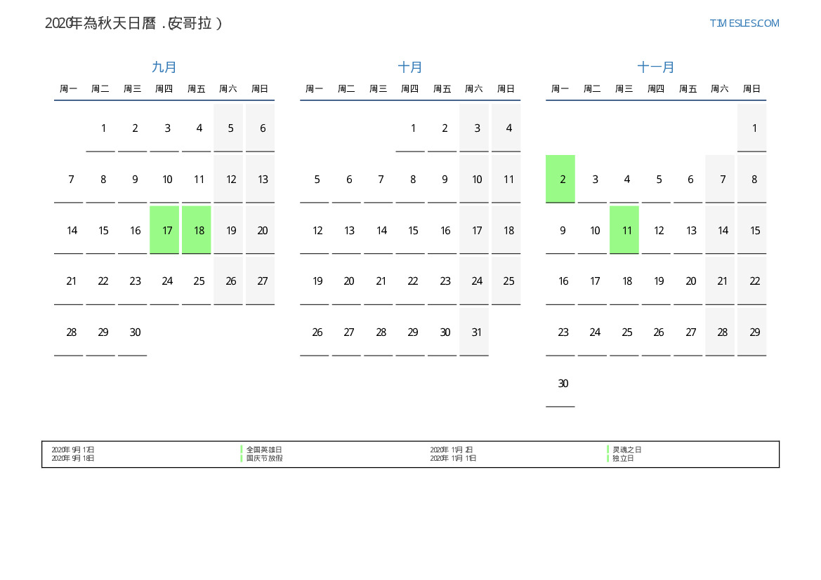 为安哥拉下載並打印2020年為秋天假期和周末的PDF日曆