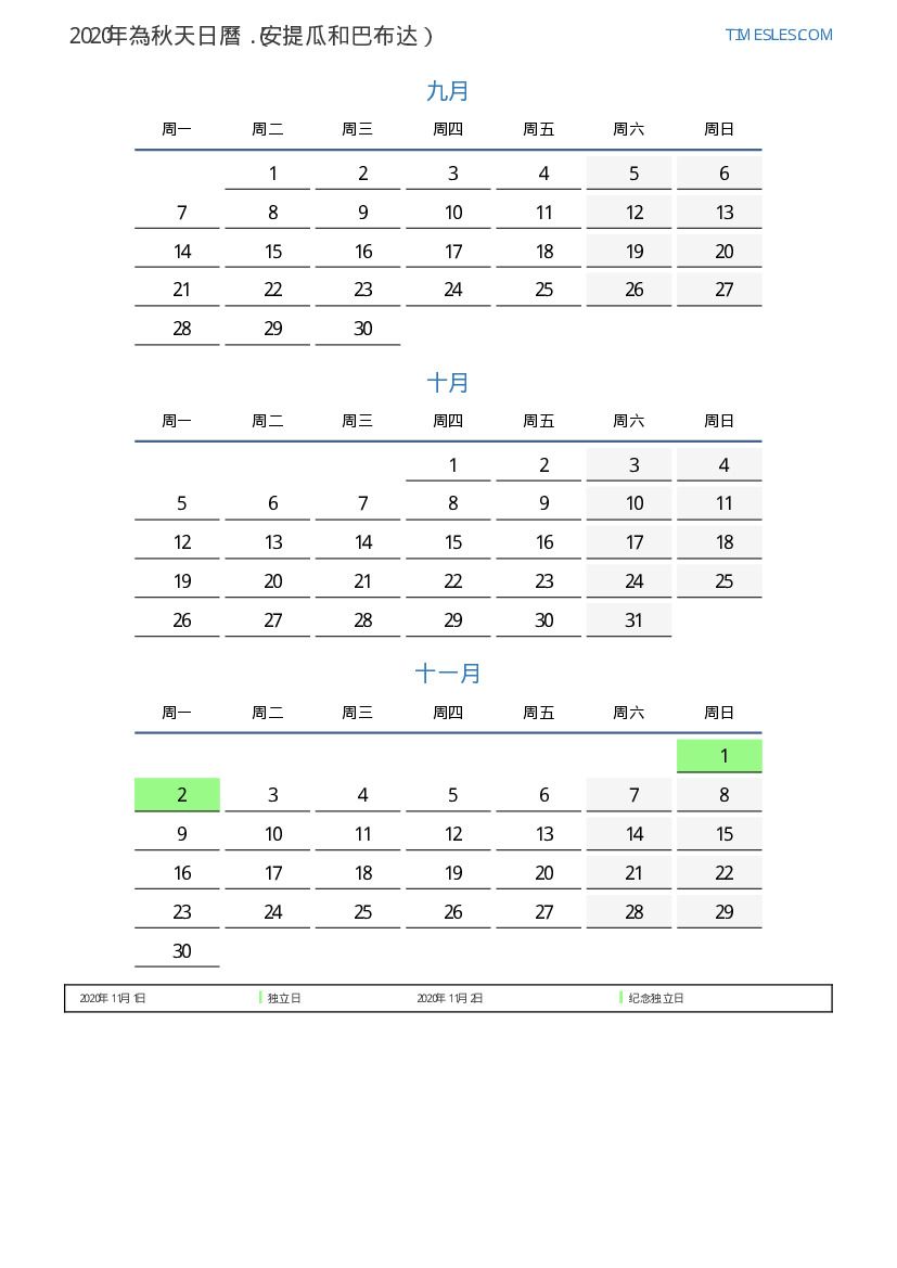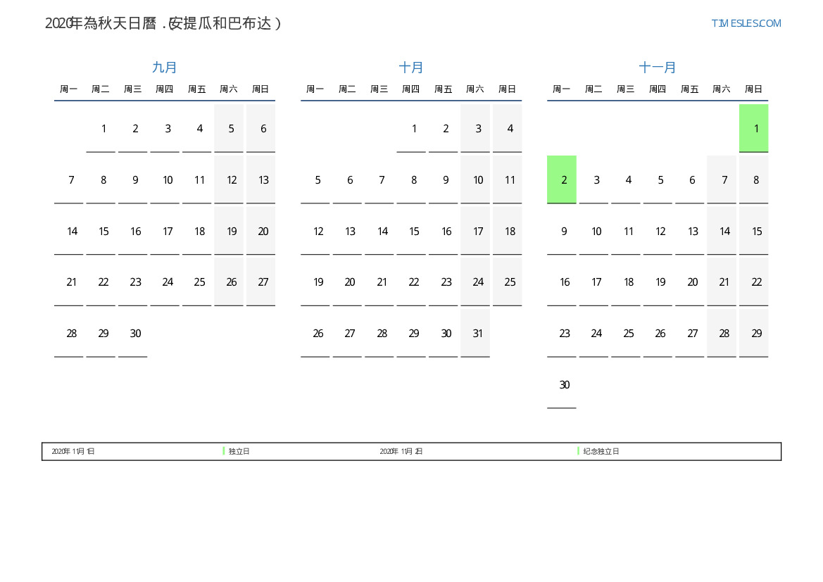 安提瓜和巴布达2020年為秋天假期和周末的日曆