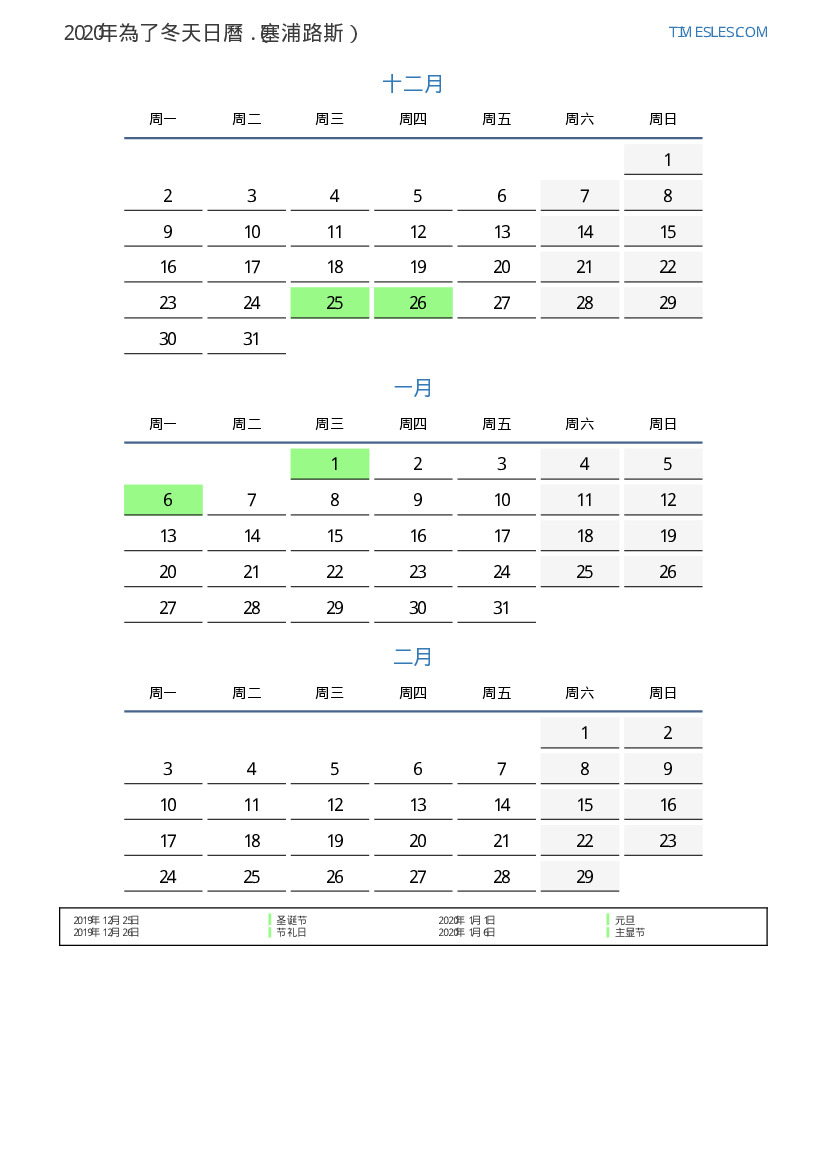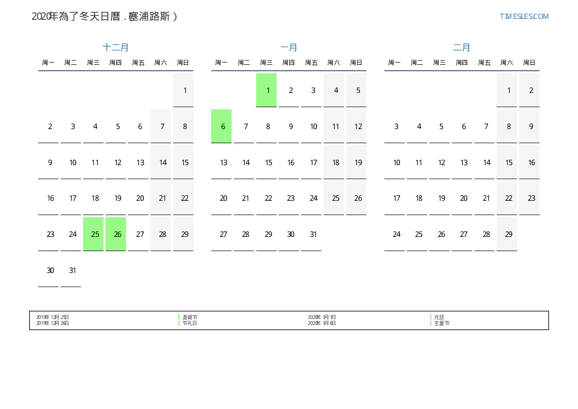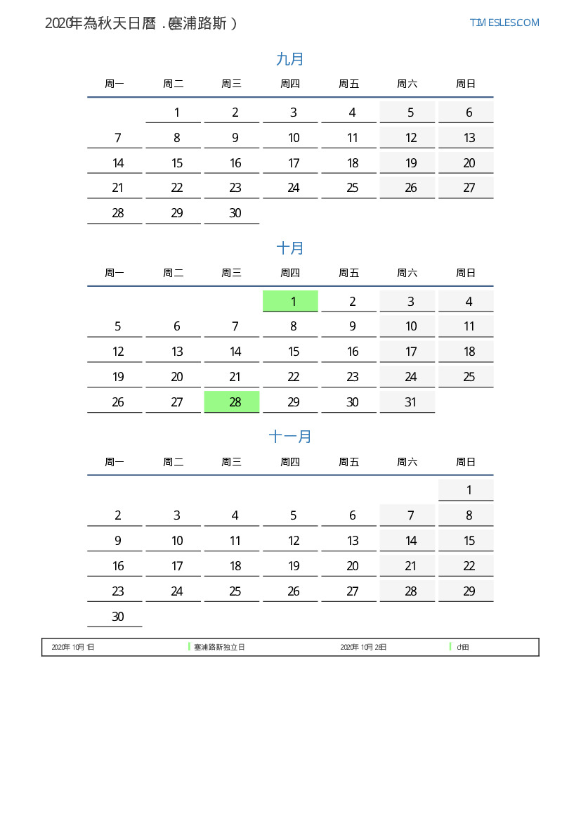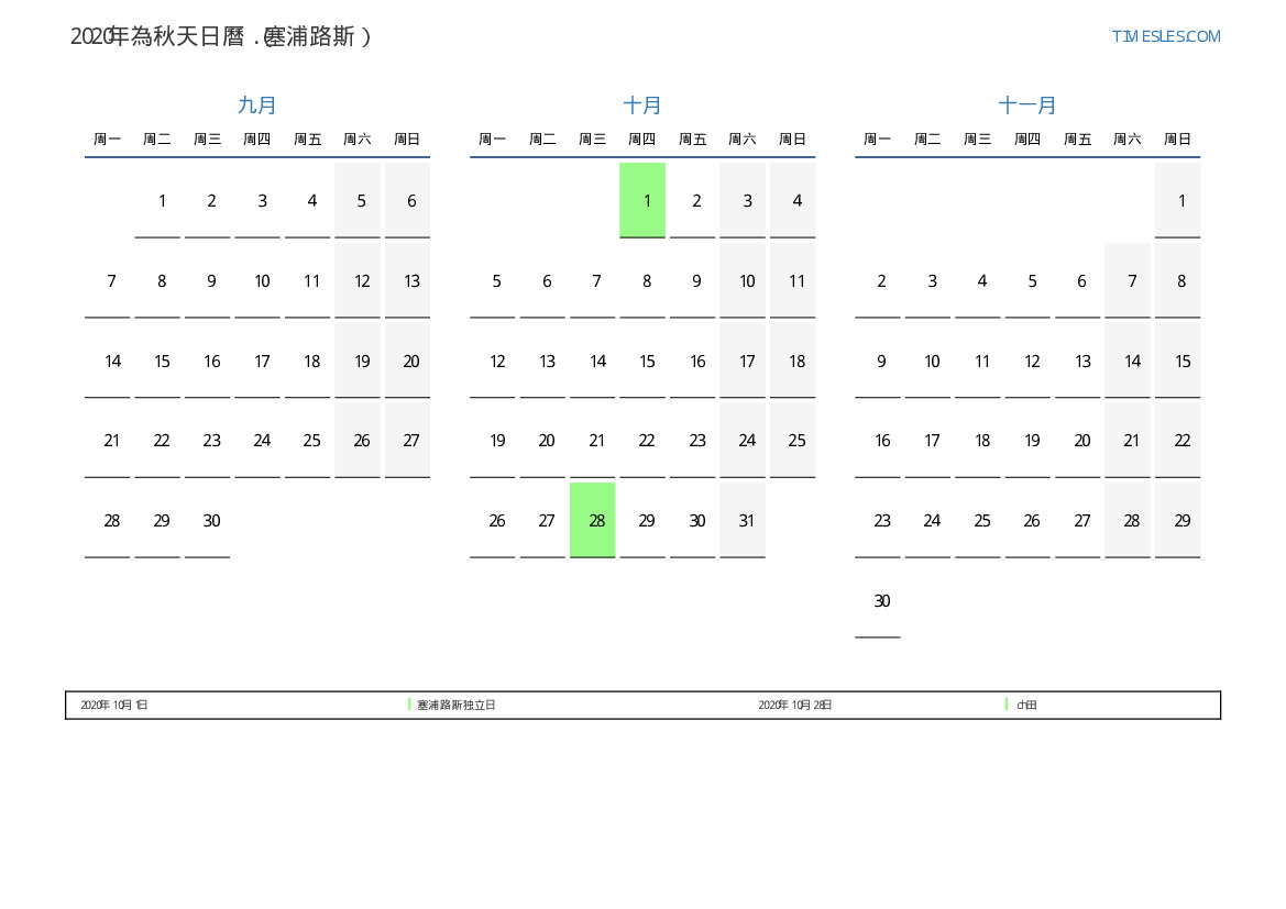 塞浦路斯2020年為秋天假期和周末的日曆