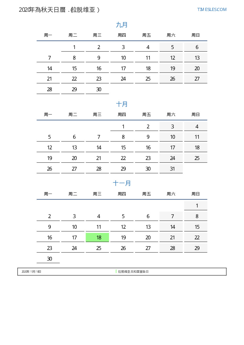 拉脱维亚下載並打印2020年為秋天假期和周末的PDF日曆