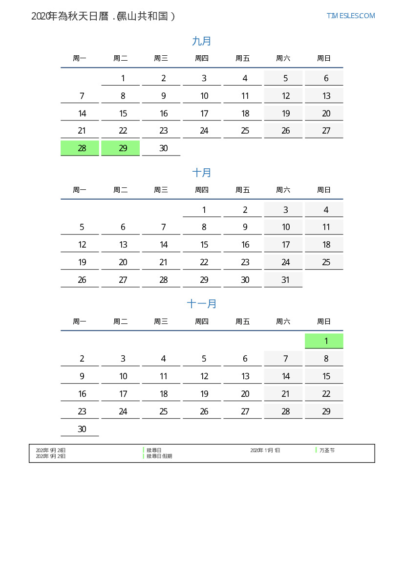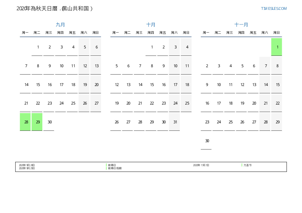 黑山共和国2020年為秋天假期和周末的日曆