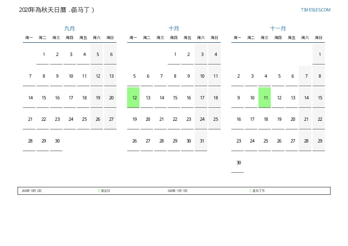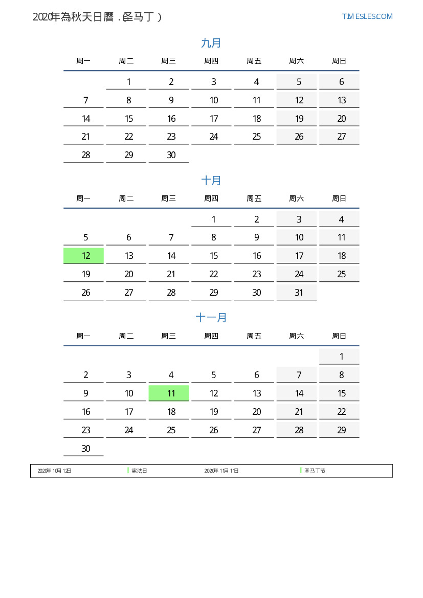 为圣马丁下載並打印2020年為秋天假期和周末的PDF日曆