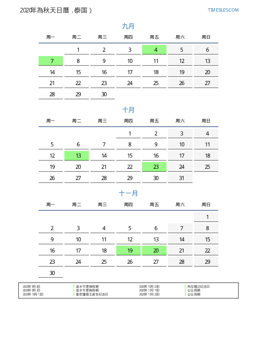 在2020年為秋天,在泰国有9 假期和休假。 2020年為秋天星期二開始,週一結束。
