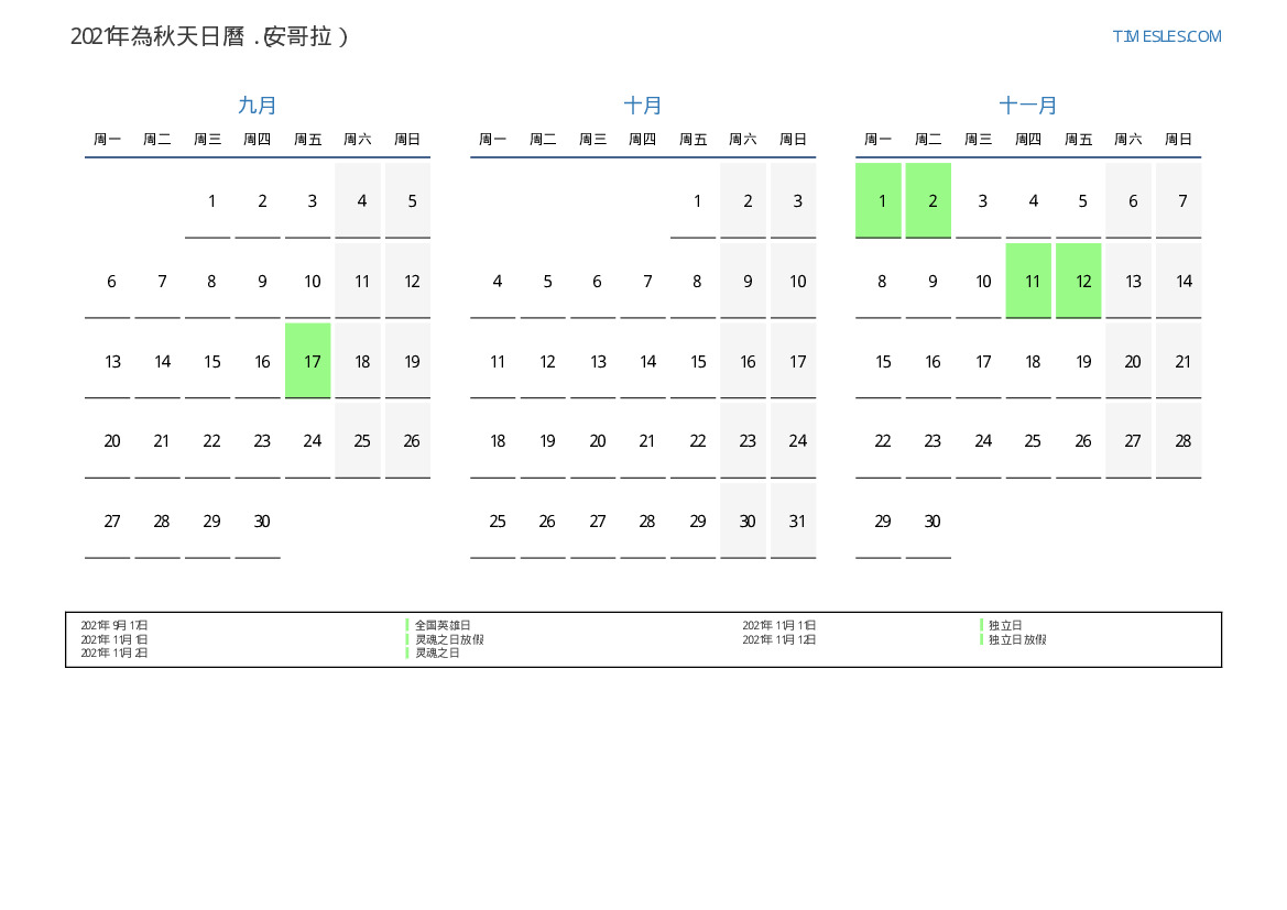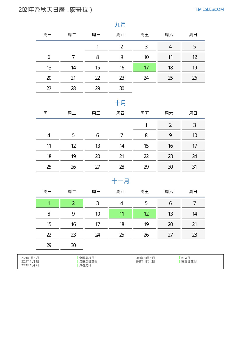 为安哥拉下載並打印2021年為秋天假期和周末的PDF日曆