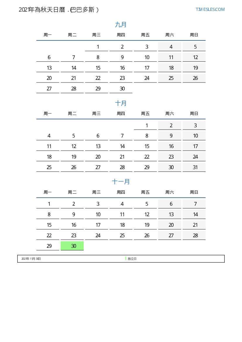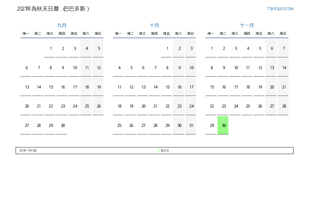巴巴多斯下載並打印2021年為秋天假期和周末的PDF日曆