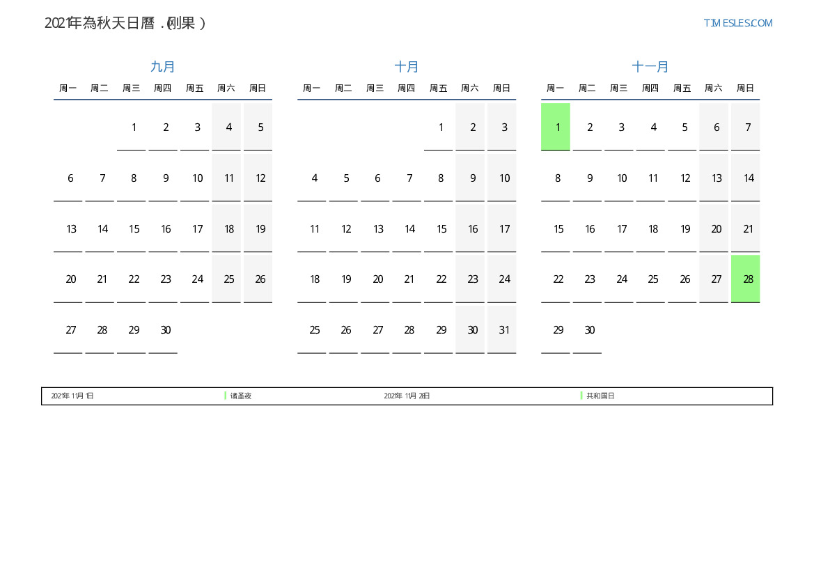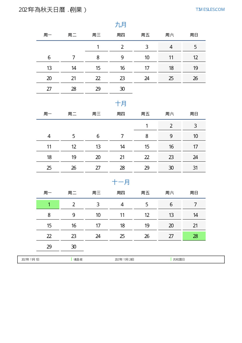 刚果下載並打印2021年為秋天假期和周末的PDF日曆