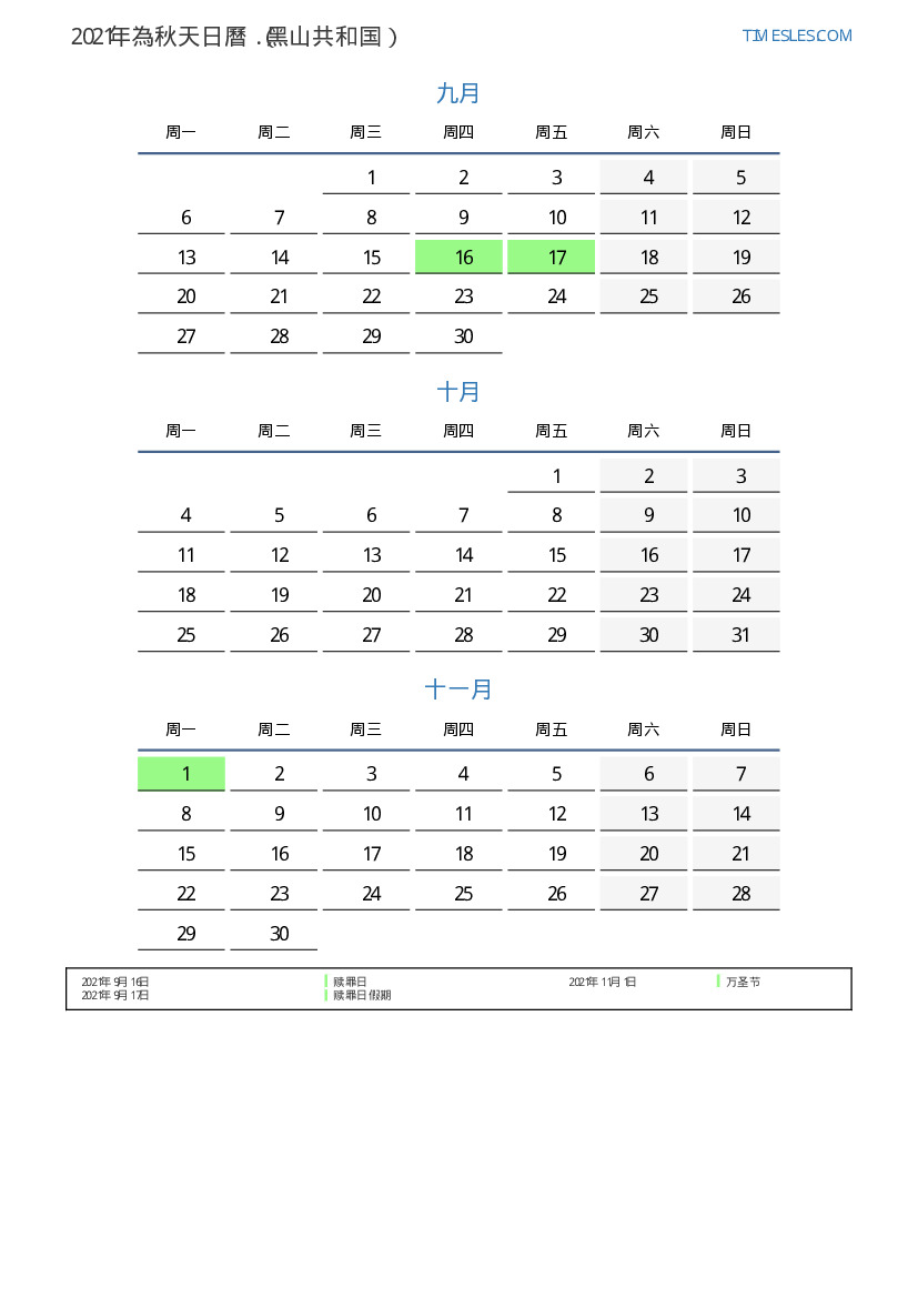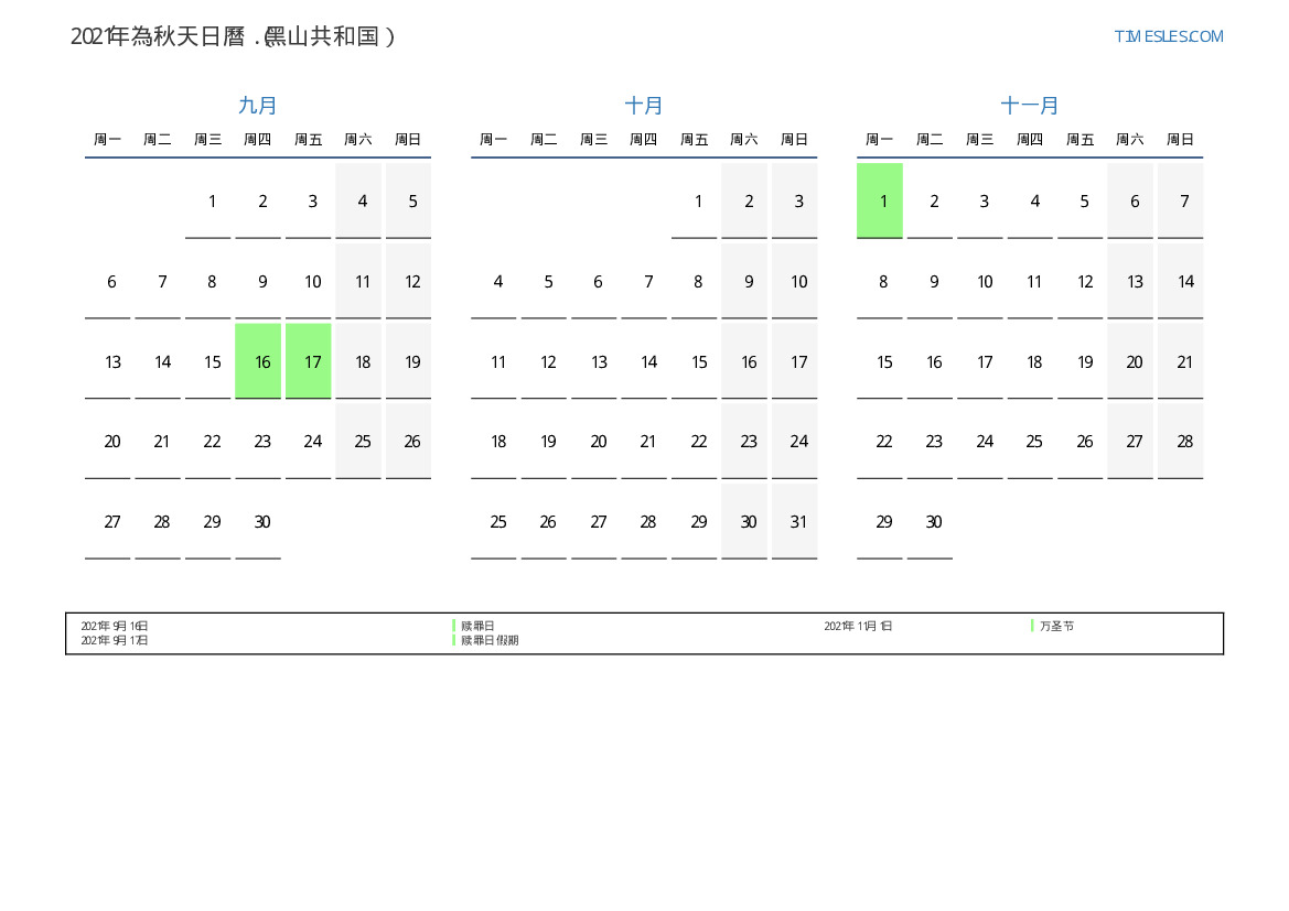 黑山共和国下載並打印2021年為秋天假期和周末的PDF日曆