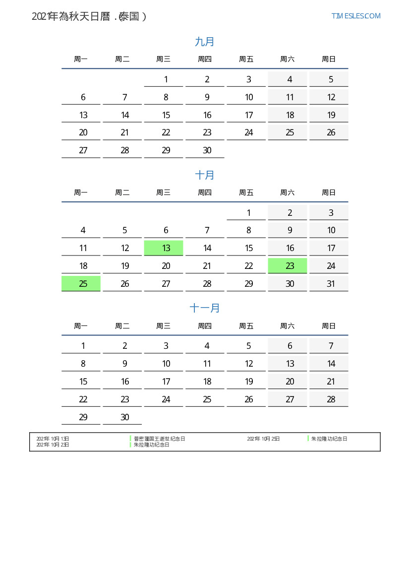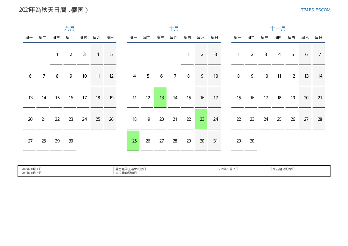为泰国下載並打印2021年為秋天假期和周末的PDF日曆