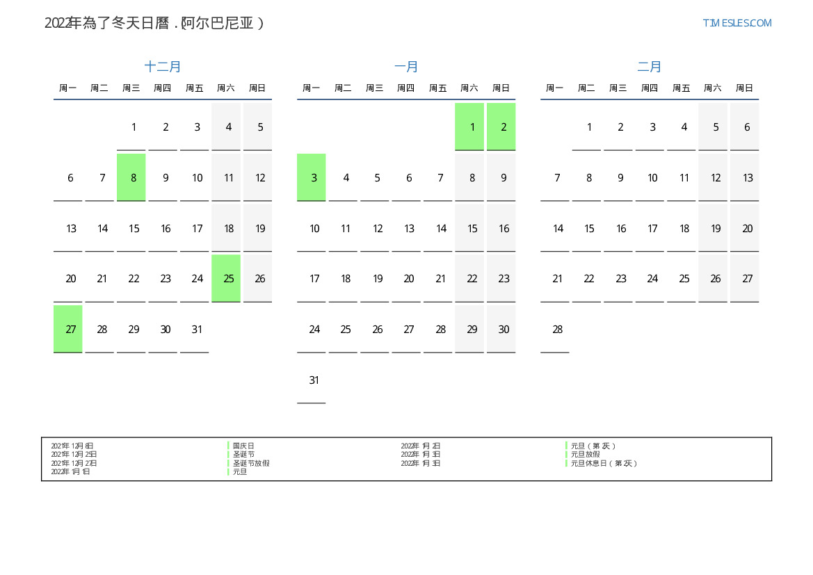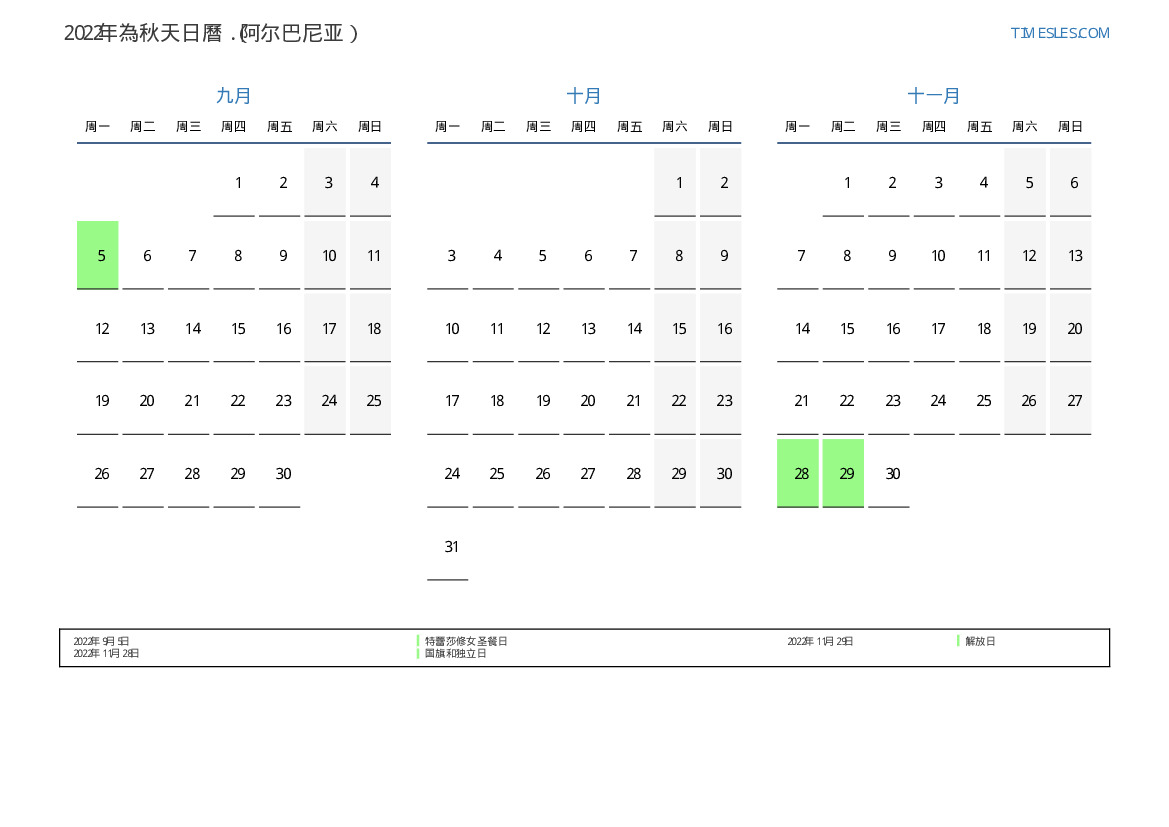 阿尔巴尼亚2022年為秋天假期和周末的日曆