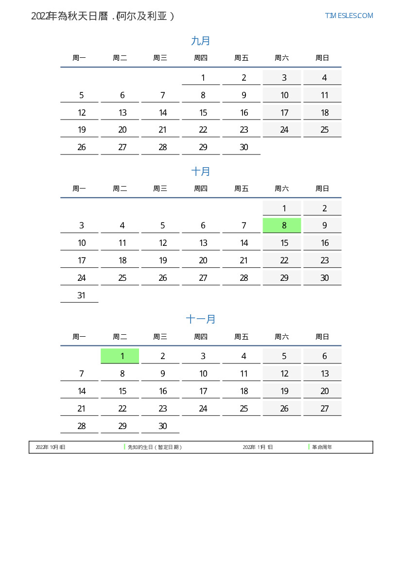 阿尔及利亚2022年為秋天日曆