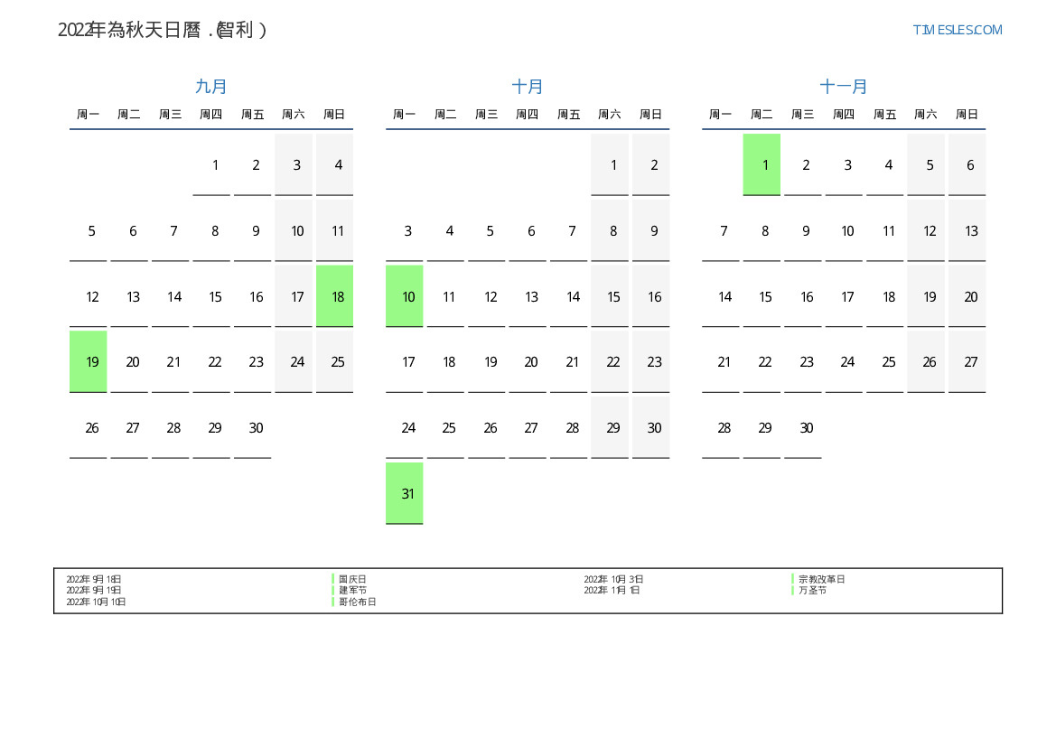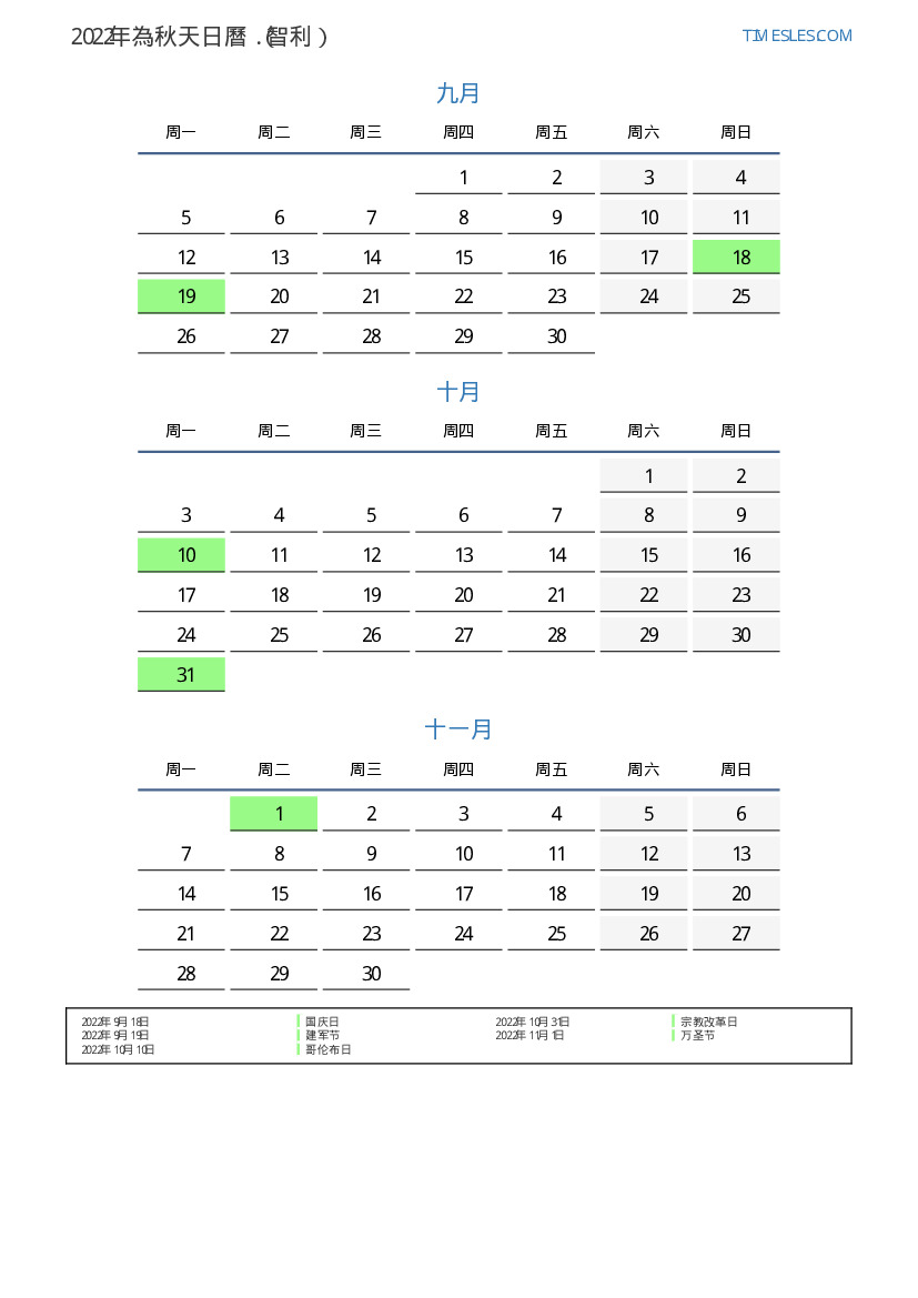 智利下載並打印2022年為秋天假期和周末的PDF日曆