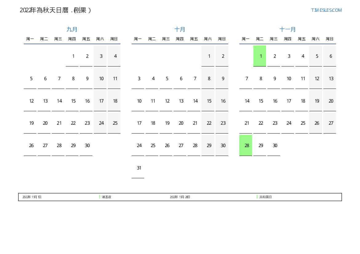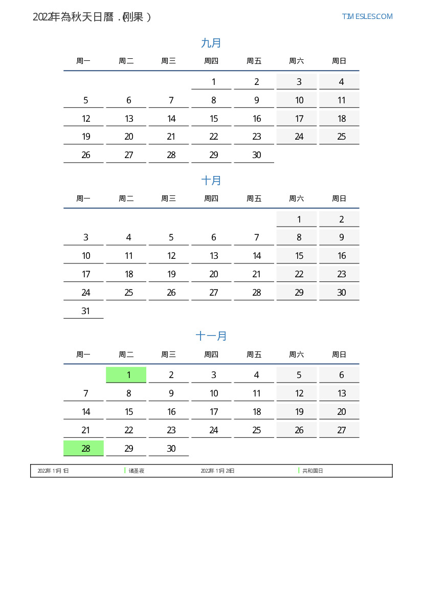 刚果下載並打印2022年為秋天假期和周末的PDF日曆