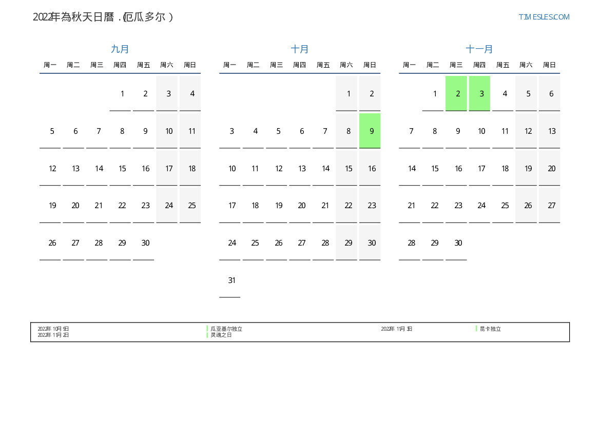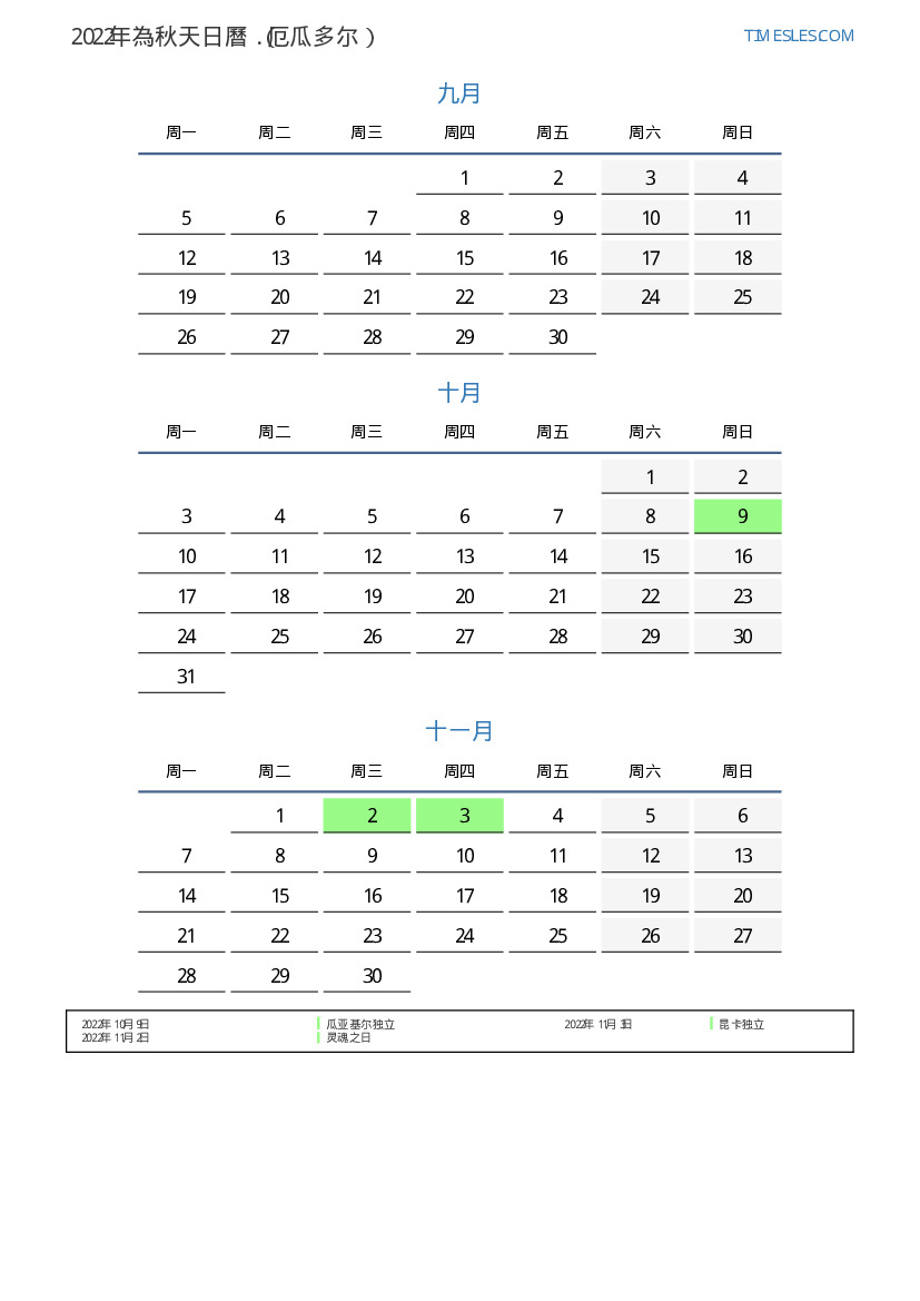 厄瓜多尔2022年為秋天假期和周末的日曆