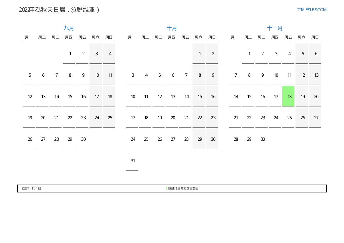 拉脱维亚下載並打印2022年為秋天假期和周末的PDF日曆