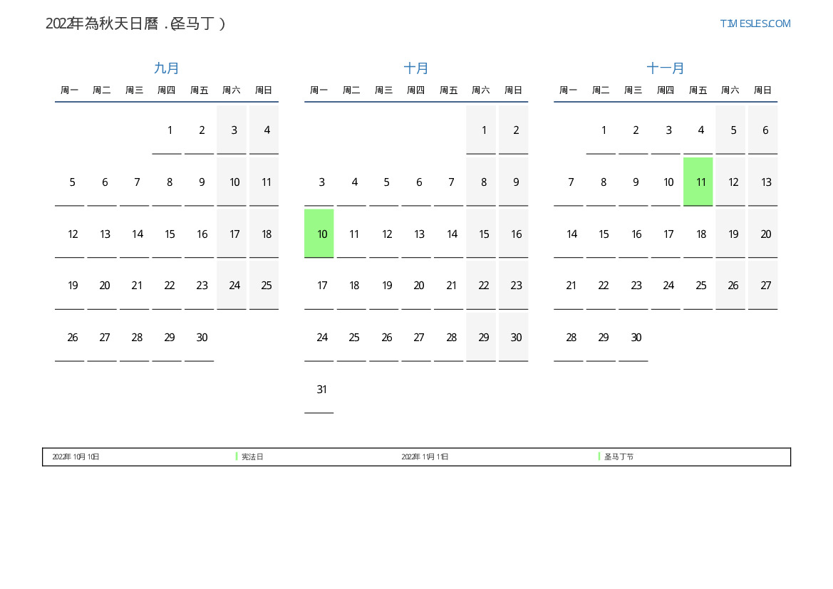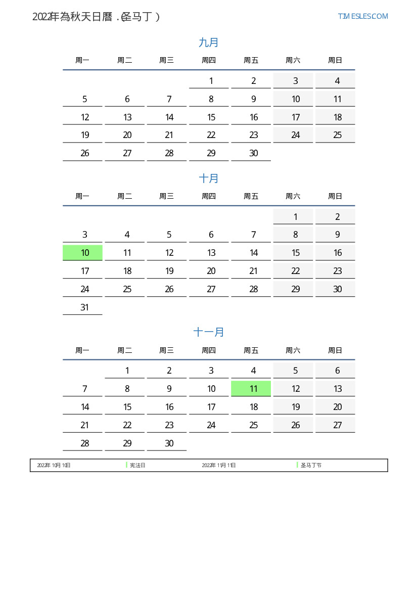 为圣马丁下載並打印2022年為秋天假期和周末的PDF日曆