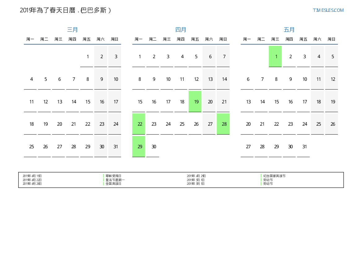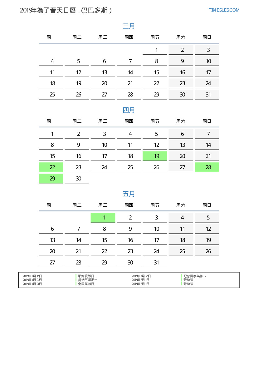 巴巴多斯下載並打印2019年為了春天假期和周末的PDF日曆