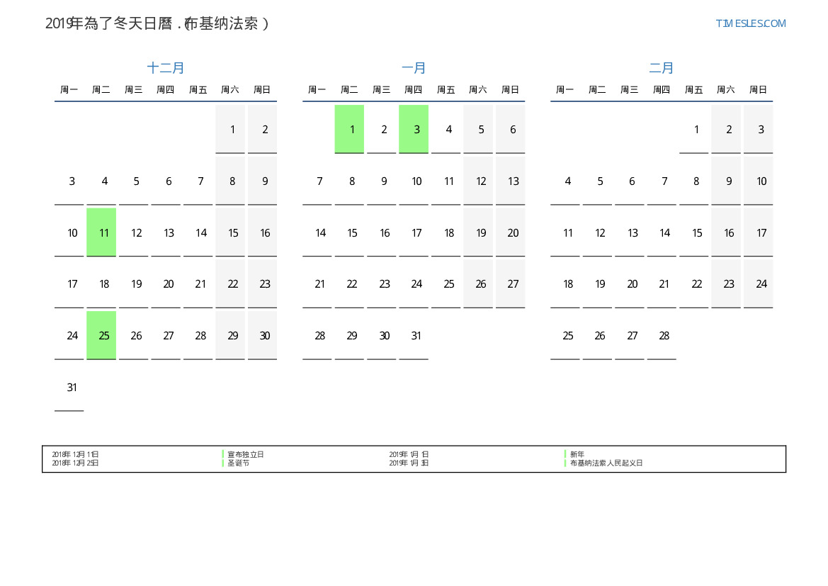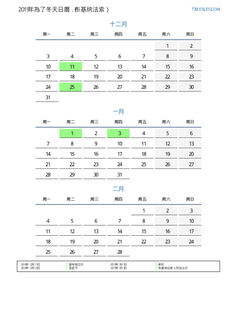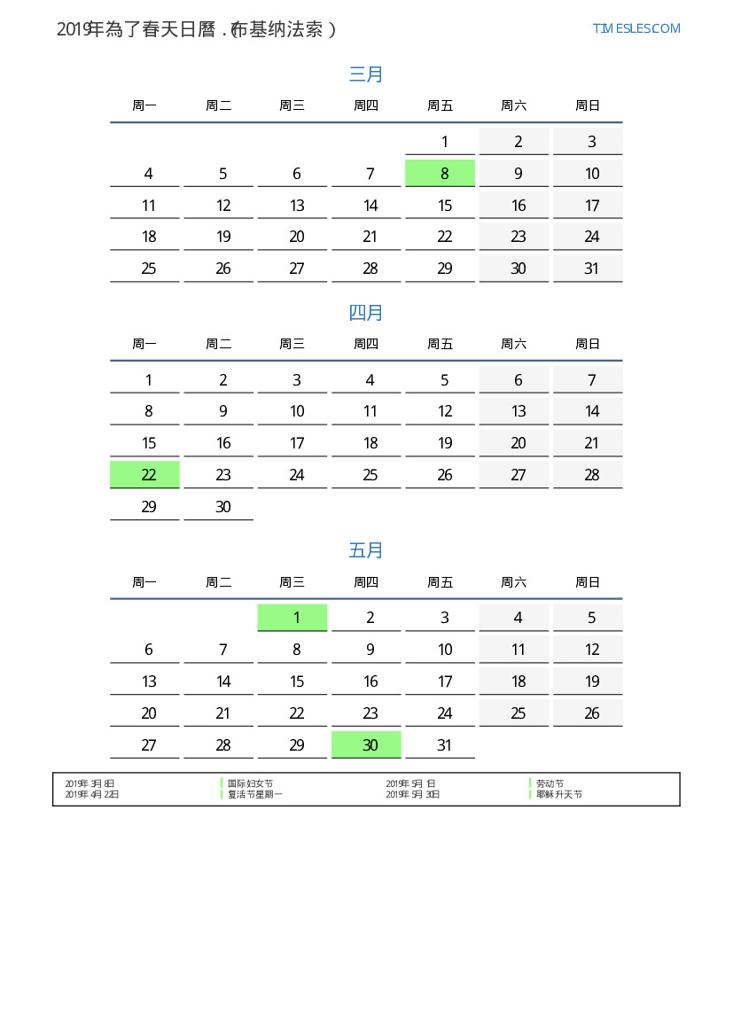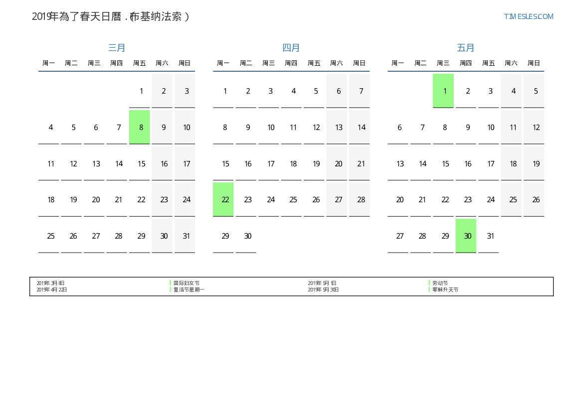 布基纳法索下載並打印2019年為了春天假期和周末的PDF日曆