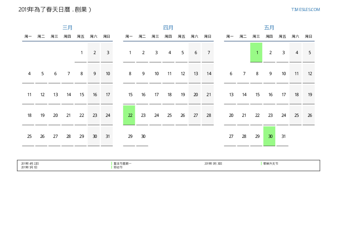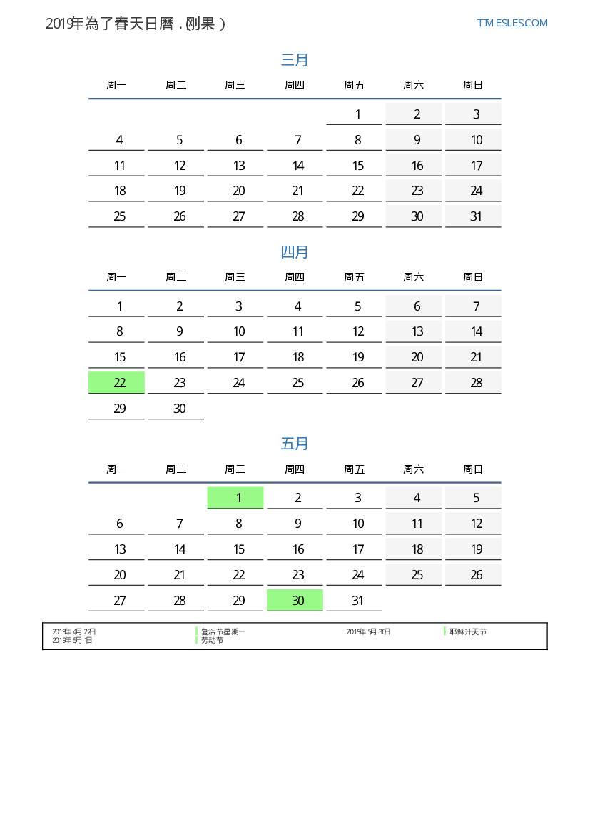 刚果下載並打印2019年為了春天假期和周末的PDF日曆