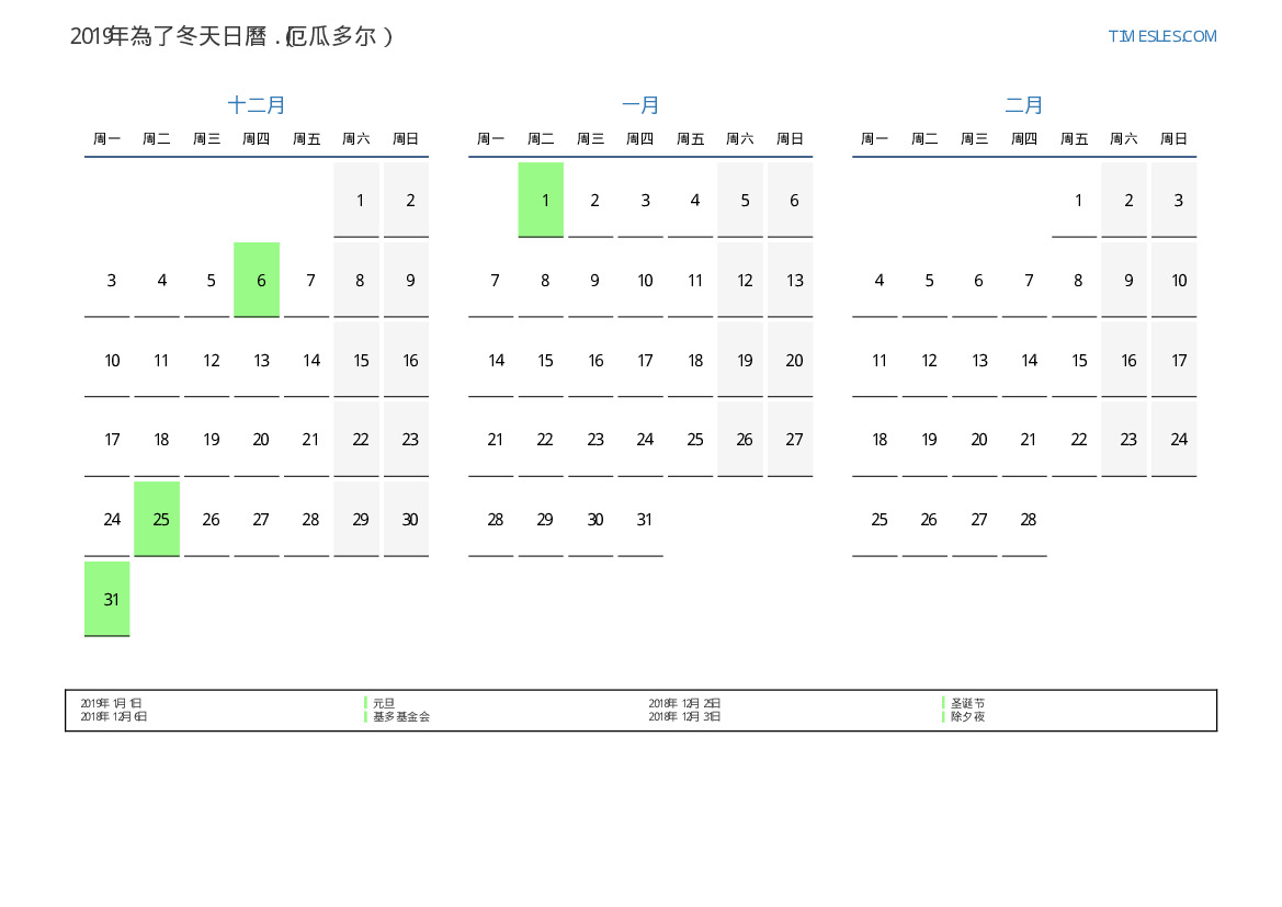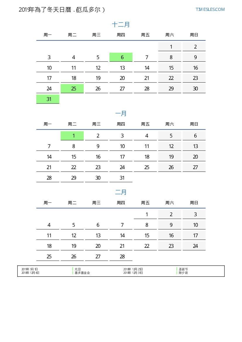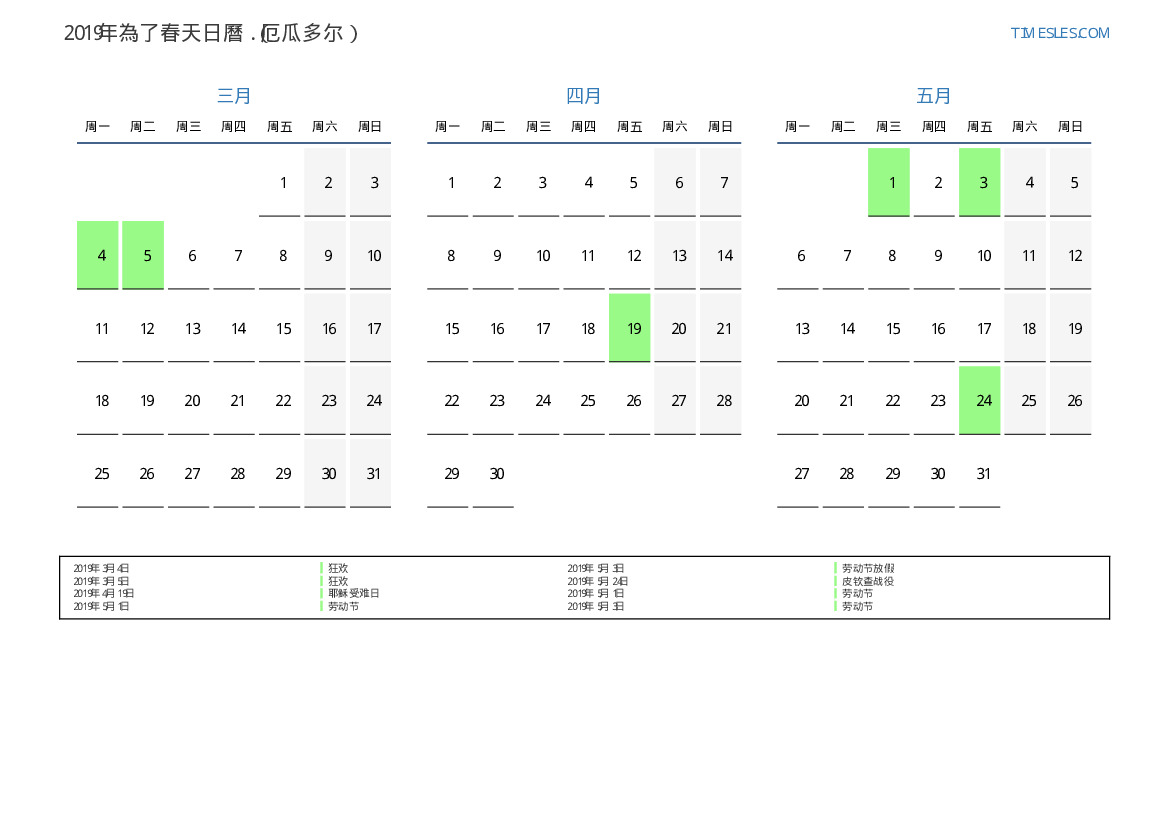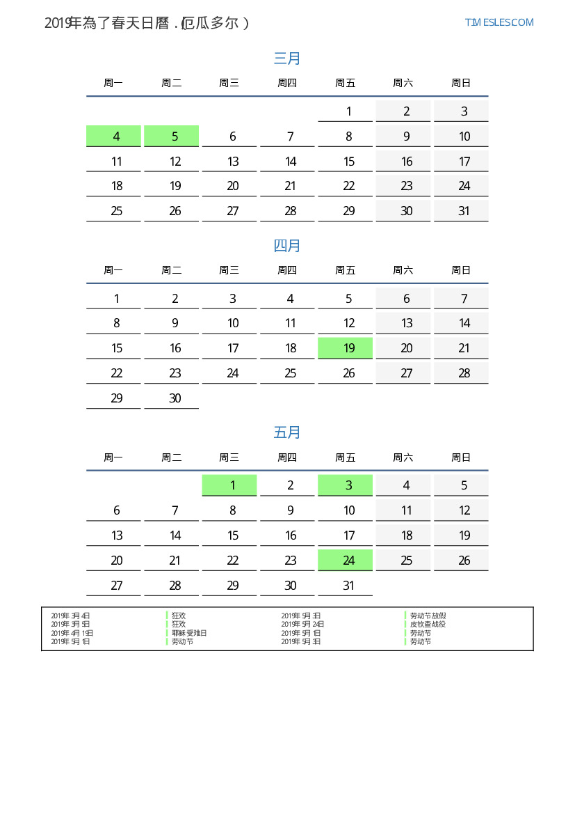 厄瓜多尔下載並打印2019年為了春天假期和周末的PDF日曆