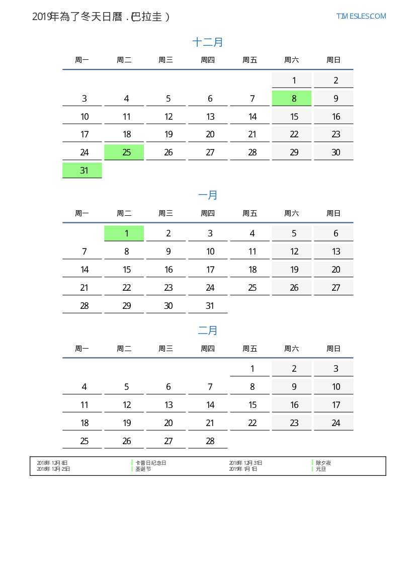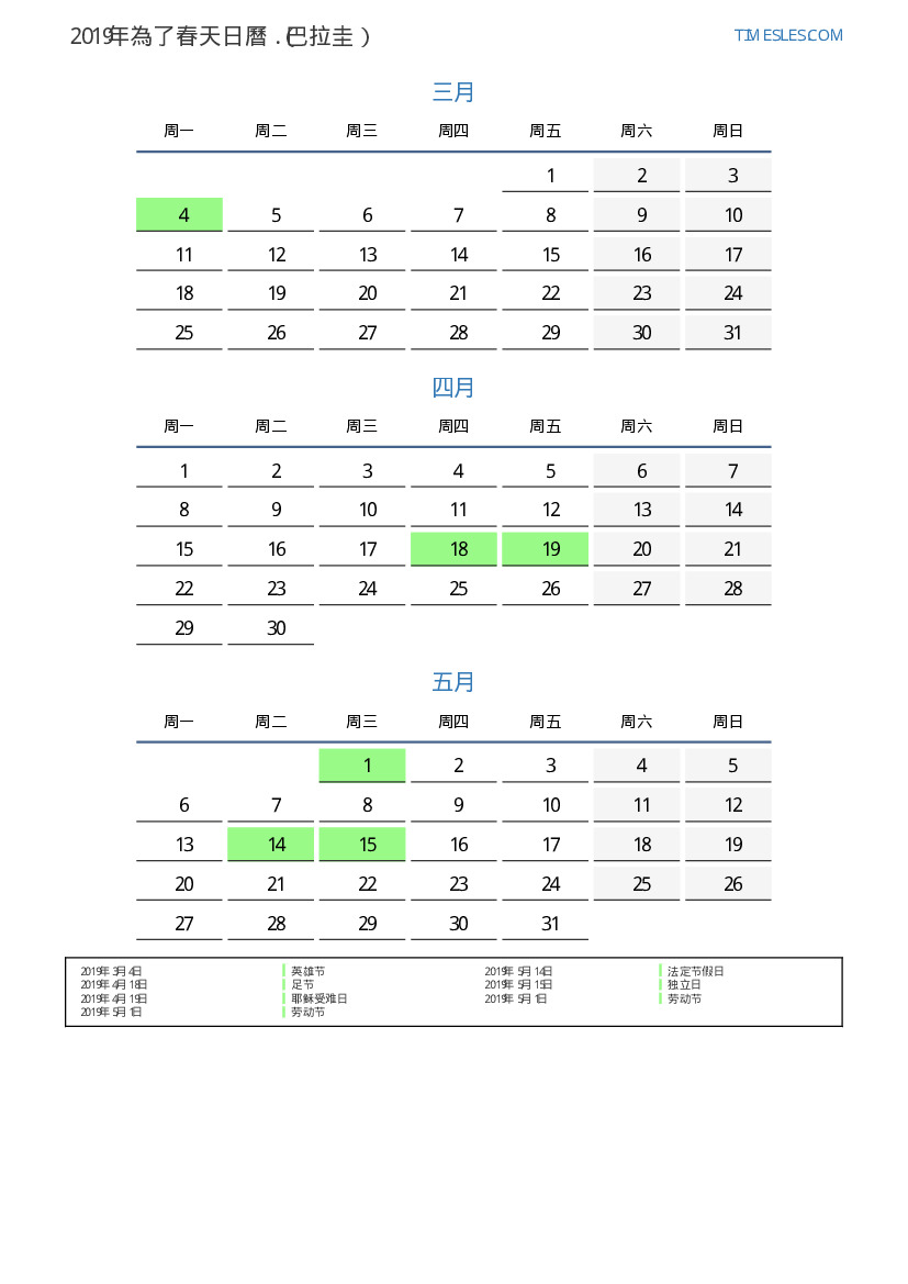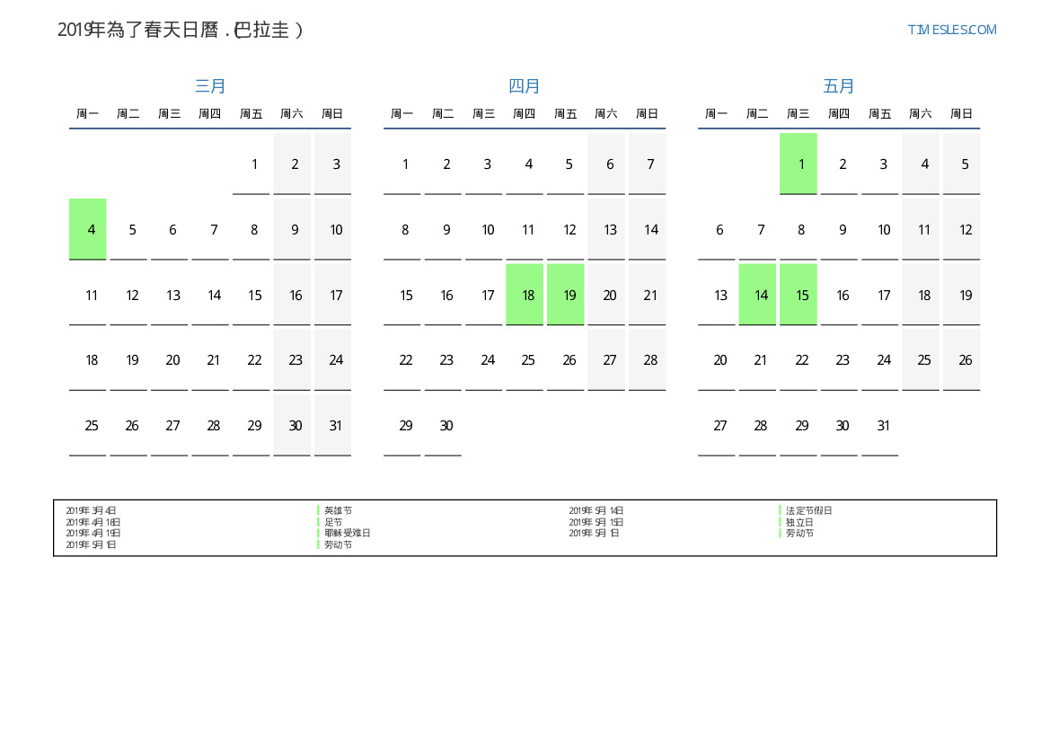 巴拉圭下載並打印2019年為了春天假期和周末的PDF日曆