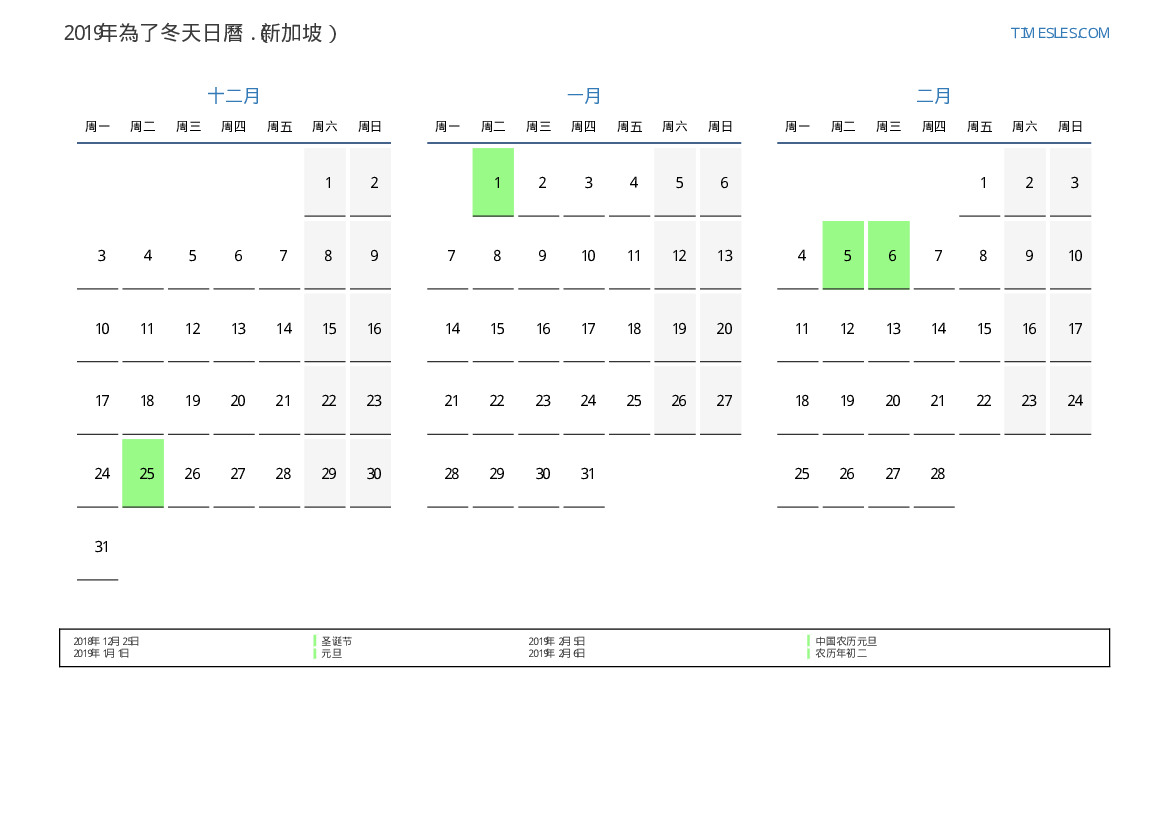 对于新加坡2019年為了春天假期和周末的日曆