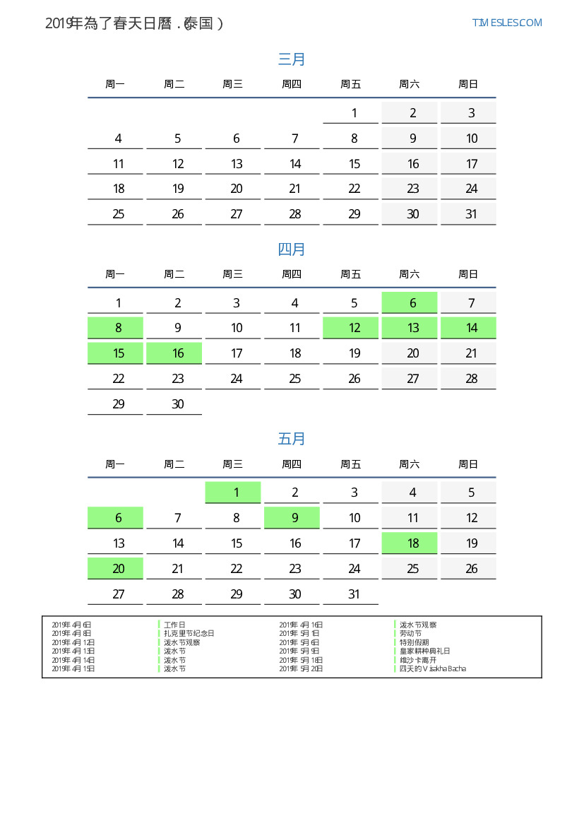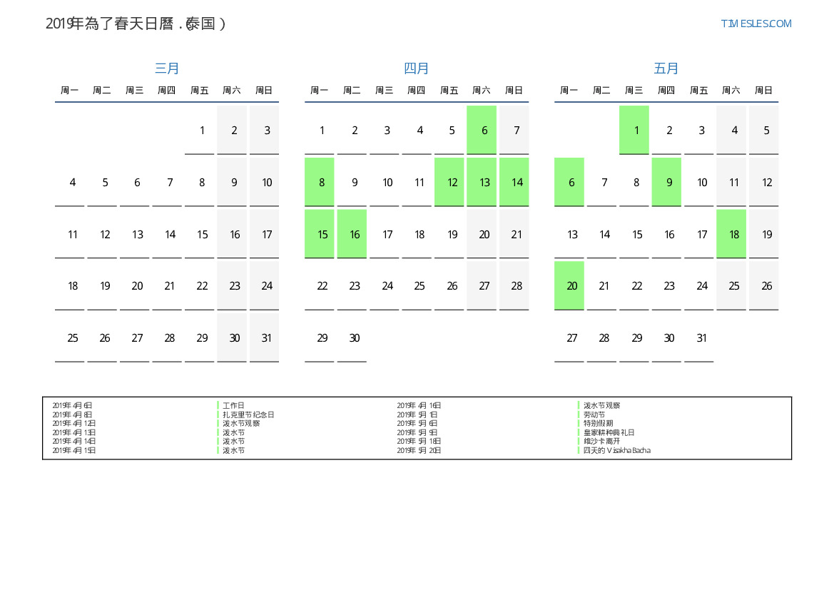 为泰国2019年為了春天假期和周末的日曆