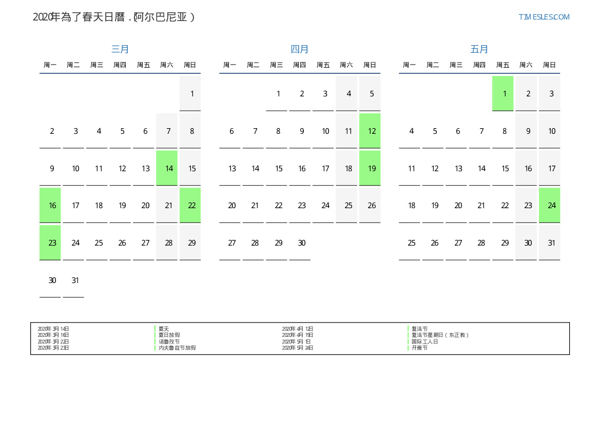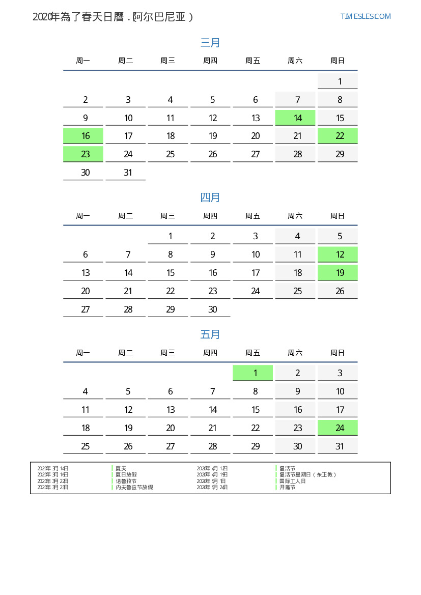 阿尔巴尼亚2020年為了春天假期和周末的日曆