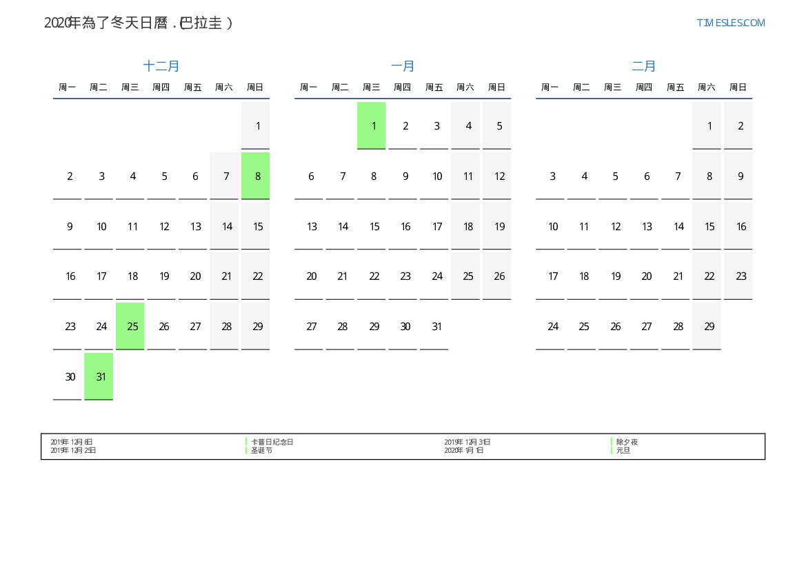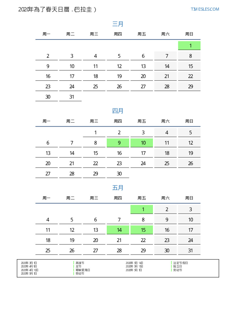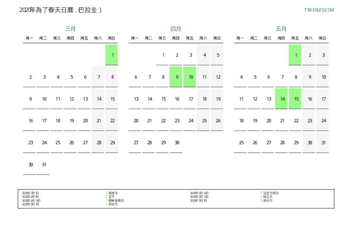 巴拉圭下載並打印2020年為了春天假期和周末的PDF日曆